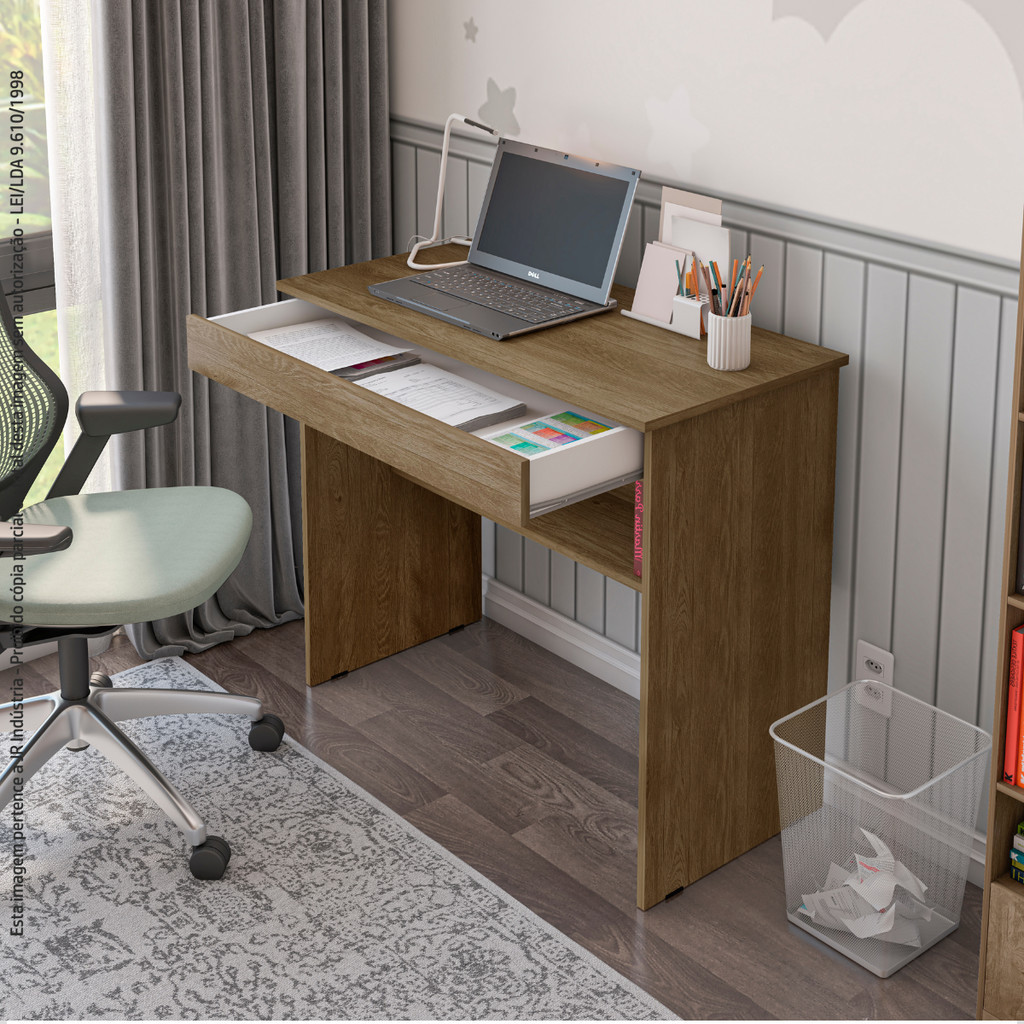 A Escrivaninha Vitória é super compacta e ideal para home office!Além de muito bonita e super moderna, com esta mesa você tem tudo o que precisa para poder trabalhar, estudar ou navegar usando seu computador no quarto ou escritório.Produto desenvolvido para suas atividades do dia a dia, prática e funcional a Escrivaninha Vitória é um produto clássico que combina com qualquer ambiente, excelente opção para você manter seu local de trabalho ou estudo organizado.Possui 01 (uma) gaveta e 01 (uma) prateleira para ajudar na organização dos objetos.Produzido em MDP e acabamento em pintura UV que completam o produto com resistência e durabilidade.DimensõesComprimento: 70 cmProfundidade: 40 cmAltura: 78 cm Embalagem: acompanha 1 escrivaninha desmontada, manual e kit para montagem.OBS: Nossos produtos vão desmontados não oferecemos este serviço! Limpeza deve ser feita com pano macio sem alvejantes!