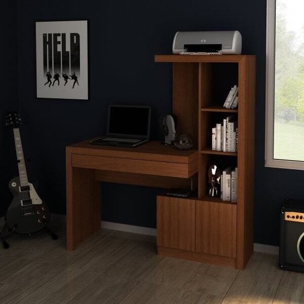 Escrivaninha Mesa Escritório com Estante 2 Portas 1 Gaveta Me4143 Amendoa
