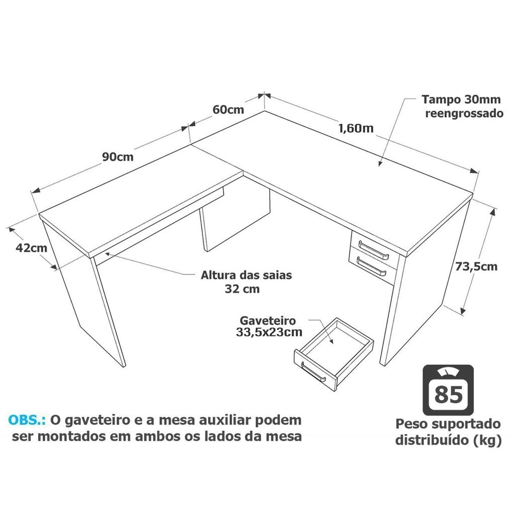 As mesas para escritório da Linha Office da NetMobil são uma excelente opção para aqueles que procuram qualidade e conforto para o seu ambiente, seja ele seu escritório, empresa ou casa. Seus traços modernos trazem fácil adaptabilidade à diferentes cenários. O material utilizado na fabricação do produto é o MDP e o acabamento das bordas em ABS. Garantindo a mais alta qualidade e durabilidade aos nossos clientes. DESCRIÇÃO TÉCNICA DO PRODUTO - Altura (cm): 73,5 - Profundidade (cm): 60 - Comprimento (cm): 160 - Medida Mesa Principal: L: 160; P: 60; A: 73,5 - Medida Mesa Auxiliar (cm): L: 90; P: 42; A: 73,5 - Gaveteiro com 2 gavetas, acompanha corrediças e todos acessórios para montagem. - Material: MDP - Bordas: ABS - Sapatas Reguladoras de Nível: Sim - Pés: 15mm de espessura Estilo: Moderno Peso (kg): 43 Dobrável: Não Garantia: 03 Meses Altura (cm): 73.5 Largura (cm): 160 Cor da Base: Branco Cor do Tampo: Branco Possui Vidro: Não Possui Portas: Não Possui Estante: Não Possui Gavetas: Sim Suporta Até (kg): 85 Modelo Infantil: Não Possui Espelhos: Não Profundidade (cm): 60 Escala de Brilho: Semi-Brilho Gaveta com Chave: Não Material dos Pés: ABS Possui Gaveteiro: Não Material do Tampo: MDP Posição Da Gaveta: Montagem Flex - Esquerda ou Direita Ambiente Principal: Escritório Espessura do Tampo (mm): 30 Material Principal: MDP Possui Passa Cabos: Não Possui Prateleiras: Não Sapatas Niveladoras: Sim Possui Porta Objetos: Não Material da Estrutura: MDP Peso Máximo por Gaveta: 15 Possui Caixa de Tomada: Não Formato da Escrivaninha: Em L Possui Suporte para CPU: Não Possui Borda Arredondada: Sim Suporta Braço Articulado: Sim, somente de encaixe Possui Suporte para Teclado: Não Material do Puxador da Gaveta: Plástico Acompanha Manual de Instalação: Sim Possui Gaveta para Pasta Suspensa: Não Possui Acabamento na Parte de Trás: Sim Marca: Netmobil Cor Interna: Branco Cor: Branco Cor do Produto: Branco Itens Inclusos: 1 Escrivaninha, Kit Ferragens e Manual de Montagem Cor Predominante: Branco Linha ou Coleção: Office Quantidade de Gavetas: 02 Gavetas