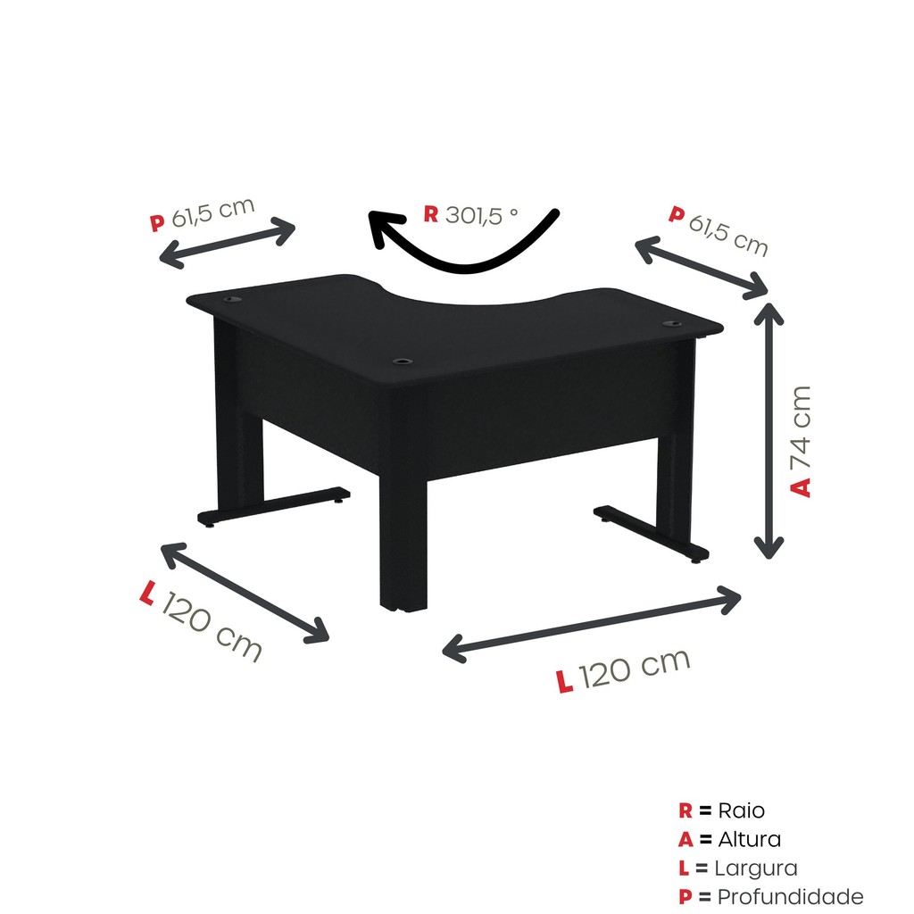 Mesa Estação de trabalho, são fabricadas em mdpbp12mm com perfil Ergosoft 180°, pés em aço do tipo \"H\" em chapa #20. Busca economia e qualidade? Oferecemos a você nossa linha econômica. Economia, melhor custo benefício, qualidade Pandin. Estilo: Clássico Peso (kg): 23.51 Dobrável: Não Garantia: 12 Meses Altura (cm): 74 Acabamento: BP Melamínico Largura (cm): 120 Pés Reguláveis: Sim Possui Gavetas: Não Suporta Até (kg): 60 Modelo Infantil: Não Profundidade (cm): 61.5 Gaveta com Chave: Não Acabamento dos Pés: Polipropileno Ambiente Principal: Escritório Espessura do Tampo (mm): 15 Material Principal: MDP Possui Passa Cabos: Não Formato da Escrivaninha: Em L Largura do Segundo Lado: 120 Possui Suporte para CPU: Não Possui Borda Arredondada: Sim Possui Suporte para Teclado: Não Marca: Pandin Móveis Cor: Preto Cor do Produto: Preto Cor Predominante: Preto Linha ou Coleção: Maxxi Quantidade de Gavetas: Não Possui Quantidade do Produto: 1