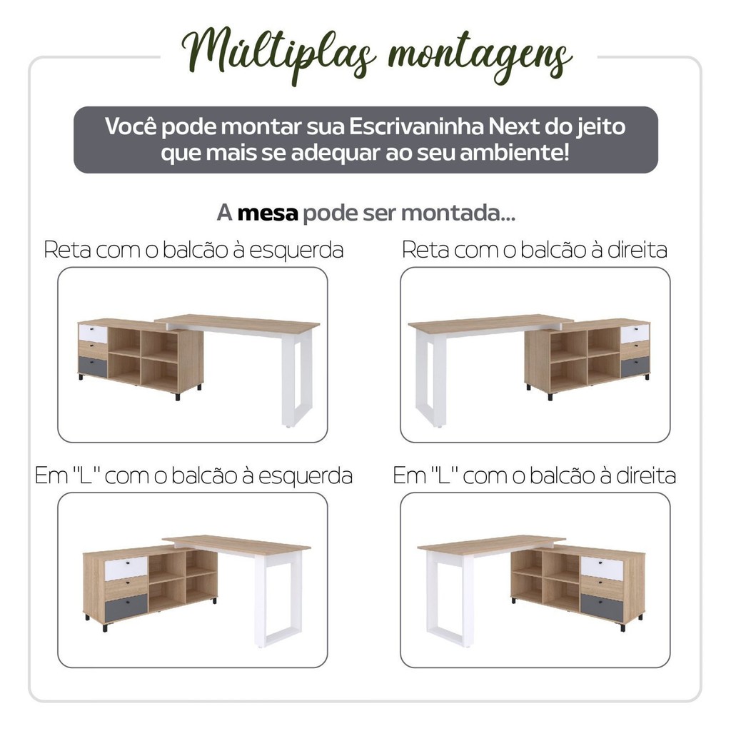 Organize e decore seu home office, escritório ou canto de estudos com esta escrivaninha linda e muito útil, perfeita para você, pois se adapta ao seu espaço! Com tamanho grande e 4 nichos, ela tem muito espaço para seus materiais e decorações, e conta com 3 gavetas ideais para organizar papéis e objetos, além de trazer um charme único! Em uma combinação harmônica entre cores e linhas, o móvel tem estilo escandinavo, com um leve toque industrial garantidos pelos pontos de cor preto nos pés e nos puxadores. Além da beleza e funcionalidade, esta escrivaninha garantirá muito conforto durante o uso, pois materiais de primeira qualidade asseguram um acabamento agradável ao toque, tamanho ergonômico e muita estabilidade e resistência. *Posição do balcão e gavetas escolhida durante a montagem! Estilo: Industrial Peso (kg): 52.3 Garantia: 03 Meses Altura (cm): 75 Acabamento: BP Largura (cm): 160.3 Cor da Base: Marrom Cor do Tampo: Marrom Possui Nichos: 4 Possui Portas: Não Pés Reguláveis: Não Possui Gavetas: Sim Possui Rodízio: Não Suporta Até (kg): 60 Modelo Infantil: Não Profundidade (cm): 136.4 Escala de Brilho: Fosco Gaveta com Chave: Não Material do Tampo: MDP Posição Da Gaveta: Montagem Flex - Esquerda ou Direita Ambiente Principal: Escritório Espessura do Tampo (mm): 15 Material Principal: MDP Possui Passa Cabos: Não Sapatas Niveladoras: Sim Material da Estrutura: MDP Peso Máximo por Gaveta: 5 Formato da Escrivaninha: Em L Largura do Segundo Lado: 136.4 Possui Suporte para CPU: Não Possui Borda Arredondada: Não Peso Máximo por Prateleira: 5 Pés com Regulagem de Altura: Sim Possui Suporte para Teclado: Não Material do Puxador da Gaveta: Metal Informações Complementares (Novo): Capacidade de Carga: 15kg distribuídos no tampo e base do balcão; 5kg distribuídos nas prateleiras e gavetas. 10kg distribuídos na mesa. Possui Acabamento na Parte de Trás: Sim Marca: Artany Cor Flex: As gavetas podem ser montadas em qualquer ordem de cor. Cor Interna: Carvalho Cor: Carvalho/Grafito/Branco Cor do Produto: Carvalho/Grafito/Branco Itens Inclusos: 1 mesa, 1 manual e 1 kit de ferragens Cor Predominante: Marrom Linha ou Coleção: Home Office Quantidade de Gavetas: 03 Gavetas