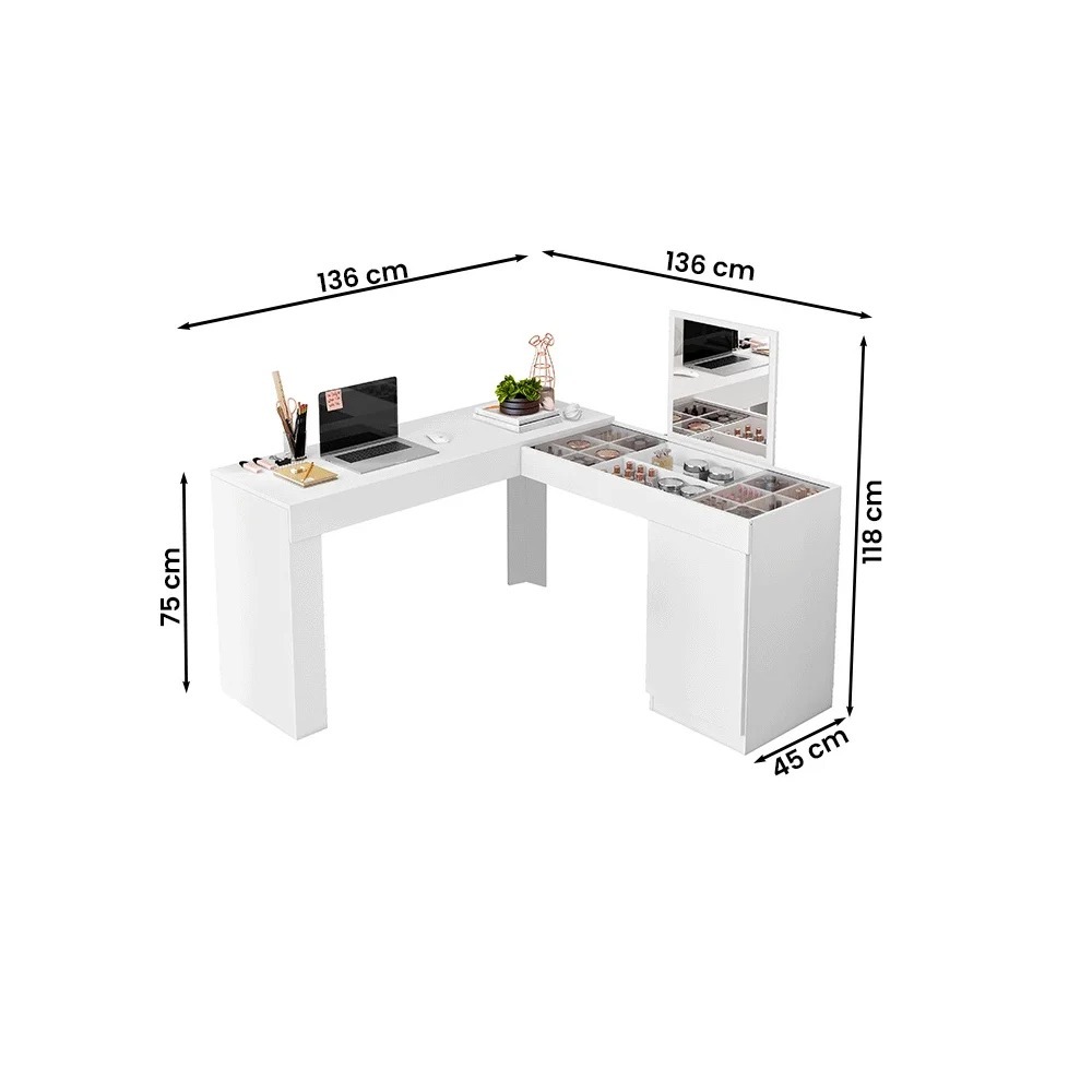 Escrivaninha Penteadeira Mobler Princesa A Escrivaninha de canto com penteadeira Princesa tem como destaque seu design moderno e despojado. Além das funcionalidades de uma escrivaninha, possui nicho organizador para objetos e joias, com vidros de correr, contendo também um painel com espelho fixo. Pois praticidade é tudo, não é mesmo? Possui porta convencional com uma prateleira interna e dobradiças metálicas, pintura UV, acabamento fosco. Com a combinação perfeita de qualidade e durabilidade tudo isso para completar sua casa Dimensões: Altura: 118 cm Largura: 136 cm Profundidade: 45 cm Peso: 36,5 kg Garantia do Fornecedor: 3 meses