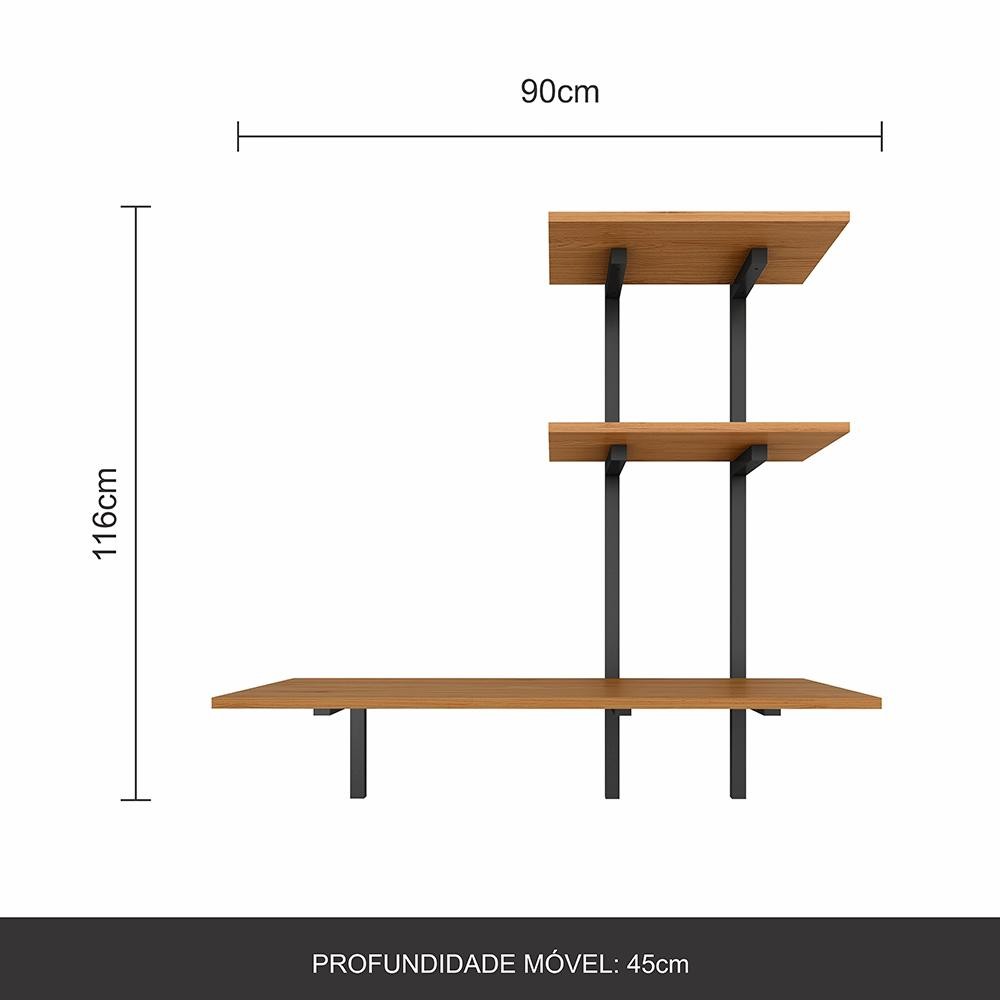 A Escrivaninha Suspensa Mykonos para trabalho ou estudo. Nada como ter um cantinho aconchegante para deixar você aconchegado, tendo uma ótima otimização do ambiente. Detalhes Técnicos: Medidas da escrivaninha Montada: A: 116cm | L: 90cm | P: 45cm Materiais de Fabricação: -Material: MDP 15MM -Pintura da estrutura: Epóxi fosco -Tonalidade: Preto fosco/Cinamomo -Peso Suportado 2 prateleiras menores: 5kg cada -Peso suportado 1 prateleira maior: 10kg -Pesos suportados podem variar da estrutura da parede -Fixado na parede: Estrutura própria para fixação -Estruturado com material de altíssima qualidade, evitando fungos e mofo. Conteúdo da Embalagem: -01 Escrivaninha -Plástico protetor -Caixa papelão -Manual de Montagem -Acessório para Montagem: Cavilhas, Parafusos, Sache de cola, Etiqueta, Tapa furo Observações Importantes: -Imagens ambientadas meramente ilustrativas, objetos decorativos não compõe o produto; -Produto novo, garantia somente para defeitos de fabricação: 3 meses; -Não realizamos entregas em zonas rurais, via caminhos fluviais e distritos, NÃO ACEITAMOS CEP GERAL; -Não trabalhamos com entrega agendada. O recebedor deve ter mais de 18 anos. O valor do frete não inclui: subida de escada, elevador ou lançamento de produto, em condomínio residencial a entrega é feita somente até a portaria. As entregas são realizadas em dias e horários comerciais; -Ao receber o produto observe se a embalagem está em perfeita condição. Confira atentamente a quantidade de volumes; -Produto entregue desmontado. É responsabilidade do cliente a montagem/instalação do produto, inclusive despesa para sua realização. Recomendamos a contratação de um profissional especializado; -Evitar a exposição direta à luz solar e à umidade. Limpar com pano macio e seco, não utilizar produtos químicos; -A cor do produto pode variar de acordo com o monitor, a iluminação do ambiente ou sua percepção visual.