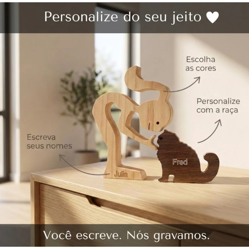 -A PRONTA ENTREGA- --------------OBSERVAÇÃO ANTES DE FINALIZAR A COMPRA: Adicione o nome e a cor do seu pet na observação ao finalizar a compra do seu pedido, assim gravaremos os nomes do seus pets!! IMPORTANTE: A caixa de presente apresentado nas imagens tem caráter ilustrativo e não acompanha o produto. Surpreenda alguém especial com a escultura de madeira personalizada! A Escultura de Madeira Pelos Pets é um produto exclusivo e artesanal que retrata o seu animal de estimação e você em uma peça de madeira de alta qualidade. Você pode escolher entre diferentes modelos de esculturas Além disso, você pode gravar o nome do seu animal de estimação e o seu na escultura, tornando-a ainda mais especial e personalizada. Assim, você terá uma lembrança única e duradoura do seu amigo peludo. A Escultura de Madeira Pelos Pets é o presente perfeito para você ou para alguém que ama os animais. Ela também é fácil de limpar e resistente a pragas. Não perca essa oportunidade de ter uma Escultura de Madeira Pelos Pets na sua casa ou escritório. Ela vai trazer mais charme e alegria para o seu ambiente, além de demonstrar o seu amor pelo seu pet. Imagens meramente ilustrativas. Garanta já a sua Escultura de Madeira Pelos Pets e surpreenda-se com a qualidade e a beleza desse produto incrível! 😊