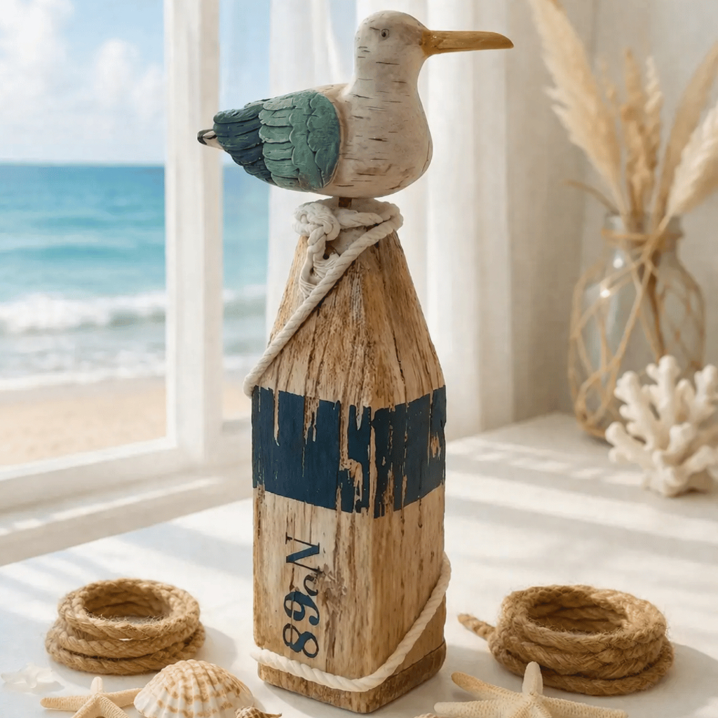Escultura Gaivota Náutica em Madeira Rústica – Decoração Praiana Artesanal Premium