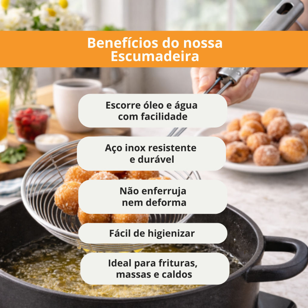 🍳✨ Escumadeira de Inox – Praticidade, Segurança e Eficiência na Cozinha A Escumadeira de Inox é um utensílio indispensável para quem busca agilidade e segurança no preparo dos alimentos. Ideal para retirar frituras, massas, legumes, carnes e alimentos de líquidos quentes com mais facilidade e precisão. Produzida em aço inoxidável de alta resistência, não enferruja, não deforma com o calor e garante longa durabilidade mesmo com uso frequente. Seu formato vazado permite a drenagem rápida do excesso de óleo ou água, deixando os alimentos mais leves e prontos para servir. O cabo longo proporciona maior alcance e segurança, evitando contato direto com o calor e tornando o manuseio mais confortável. Perfeita tanto para uso doméstico 🏡 quanto profissional 👩🍳, sendo uma excelente escolha para cozinhas residenciais, restaurantes e lanchonetes. ✅ Principais Benefícios: ✔ Fabricada em aço inox resistente ✔ Não enferruja e não deforma ✔ Drenagem rápida de líquidos ✔ Ideal para frituras, massas e cozimentos ✔ Cabo longo para mais segurança ✔ Fácil de limpar e higienizar ✔ Pode ser lavada manualmente ou na lava-louças 📌 Especificações: • Material: Aço Inox • Cor: Inox 📦 Conteúdo da Embalagem: Conforme variação selecionada ⚠️ ATENÇÃO IMPORTANTE: Antes de finalizar sua compra, verifique atentamente a opção escolhida. Trabalhamos com variações de 1 ou 2 unidades, portanto é essencial selecionar corretamente a quantidade desejada no momento do pedido para evitar trocas ou devoluções. Mais praticidade, segurança e eficiência para sua rotina na cozinha. 🍳✨