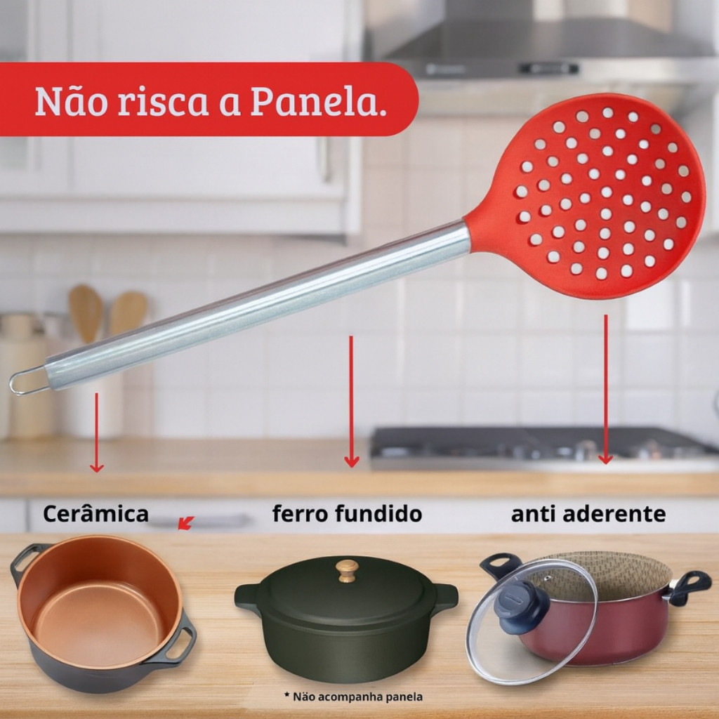 | Escumadeira Vermelha Silicone com Cabo Inox Suporta Altas Temperatu... este produto | R$ 9,90 | 67% | 4.7/5 | — |