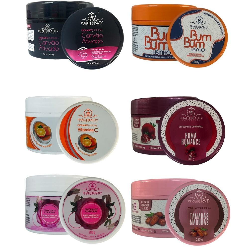 Esfoliante Vitamina c : Presença de 7 ativos * Resveratrol * Acido Ferulico * Extrato de Kiwi * Extrato de laranja * Extrato de Framboesa * Óleo de Pêssego * Manteiga de Manga Benefícios do Esfoliante Vitamina C: - Propriedade Antioxidante - Remove células mortas e outras impurezas - Pele revigorada e energizada - Indicada para todos os tipos de pele Esfoliante Carvão Ativado : Esfolia, Hidrata é Suaviza a pele: * Óleo de Uva * Manteiga de Cacau * Esfoliante de Jojoba Benefícios do Esfoliante Carvão Ativado : - Anti - poluição - Indicado para todos os tipos de pele - Pele hidratada e revitalizada