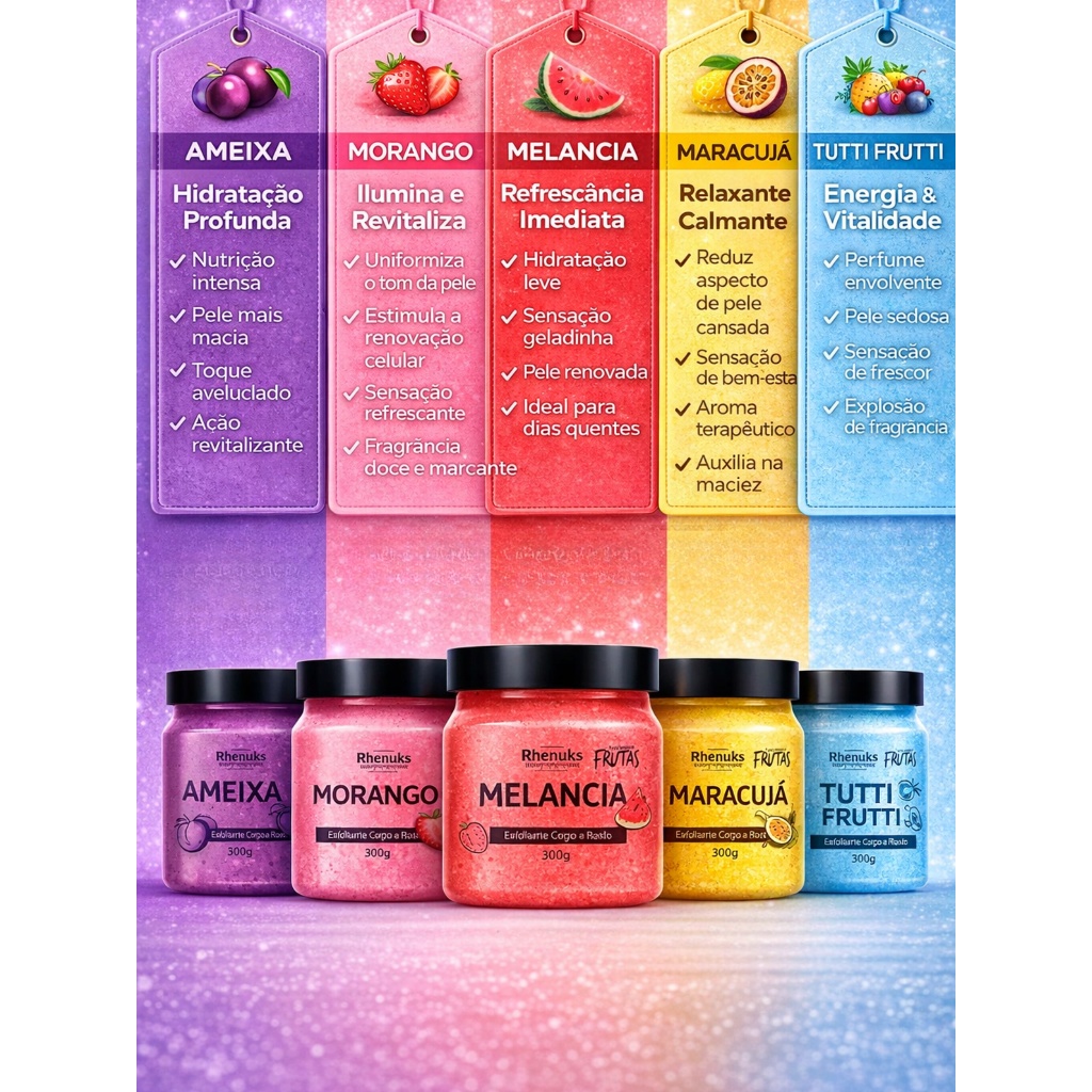 ✨ Esfoliante Corporal e Facial 300g – Limpeza Profunda e Pele Macia O esfoliante Rhenuks é ideal para quem busca pele lisa, hidratada e perfumada todos os dias. Sua fórmula promove esfoliação eficiente, removendo células mortas, combatendo a oleosidade e estimulando a renovação celular. Fragrâncias Disponíveis: 🍇 Ameixa – Hidratação profunda e toque aveludado 🍓 Morango – Ilumina e revitaliza a pele 🍉 Melancia – Refrescância imediata e sensação geladinha 🥭 Maracujá – Relaxante e calmante 🍬 Tutti Frutti – Energia e perfume marcante 🌸 Pitaya - Doce, suave e envolvente 💖 Benefícios: ✔️ Limpeza profunda da pele ✔️ Remove células mortas e impurezas ✔️ Auxilia na renovação celular ✔️ Controla a oleosidade ✔️ Pele macia e sedosa ✔️ Fragrância duradoura ✔️ Ideal para rosto e corpo ✔️ Indicado para todos os tipos de pele 📦 Contém: 300g 🛁 Uso corporal e facial 💆♀️ Perfeito para rotina de skincare e spa em casa.