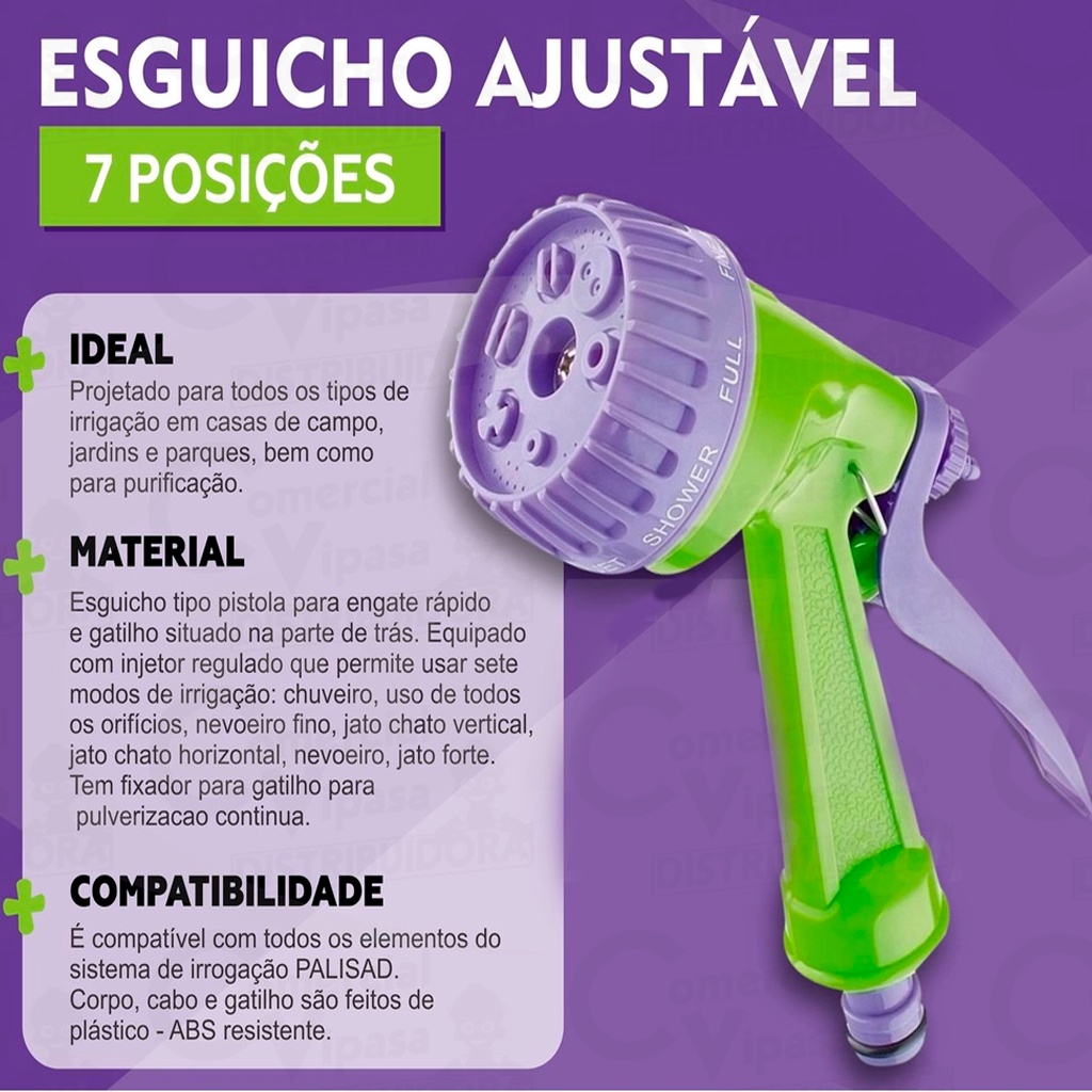 COMERCIAL VIPASA DISTRIBUIDORA Esguicho Tipo Pistola Palisad Com Multi Jato Regulável Ajustável 7 Posições Resistente Mangueira ESGUICHO TIPO PISTOLA COM JATO AJUSTÁVEL 7 POSIÇÕES - Descrição: Esguicho tipo pistola para engate rápido o gatilho é situado na parte de trás. Equipado com o injetor regulador que permite usar sete modos de irrigação: chuveiro, uso de todos os orifícios, nevoeiro fino, jato chato vertical, jato chato horizontal, nevoeiro, jato forte. Tem fixador para gatilho para pulverização contínua. Projetado para todos os tipos de irrigação em casas de campo, jardins e parques, bem como para purificação. É compatível com todos os elementos do sistema de irrigação PALISAD e PALISAD Luxe. Corpo, cabo e gatilho são feitos de plástico-ABS resistente. - Quantidade de modos: 7 - Material: Plástico - Peso: 0.11KG - Tipo de esguicho: Pistola - #Esguicho #EsguichoTipoPistola #TipoPistola #EsguichoPalisad #Palisad #7Posições #Ajustavel #ComAjuste #PosiçõesDeJato 💦 Esguicho de Jardim em PVC com 7 Tipos de Jato – Palisad 651618 O Esguicho de Jardim Palisad 651618 é a escolha ideal para quem busca praticidade, economia de água e versatilidade na irrigação. Fabricado em PVC de alta qualidade, o produto oferece 7 tipos diferentes de jato, ajustáveis facilmente por meio do bico rotativo. Ideal para regar plantas, gramados, lavar calçadas, veículos e diversas outras aplicações domésticas ou profissionais. ✅ Características do Produto: Marca: Palisad Modelo: 651618 Material: Corpo em PVC resistente Tipo: Esguicho multifunção para mangueiras de jardim Quantidade de Jatos: 7 tipos diferentes Conexão: Compatível com engate rápido padrão 1/2" Cores: Corpo colorido com detalhes em cinza 🌊 Modos de Jato: Jato concentrado Jato neblina Jato chuveirinho Jato plano vertical Jato plano horizontal Jato para enxágue Jato suave 🛠️ Aplicações: Irrigação de jardins e hortas Limpeza de calçadas, pisos e veículos Uso doméstico e profissional Ideal para áreas externas e quintais 🧰 Vantagens: Prático e fácil de usar Econômico no consumo de água Leve e resistente à corrosão Troca rápida dos jatos com apenas um giro Alta durabilidade mesmo sob exposição ao sol e intempéries 📦 Conteúdo da Embalagem: 1x Esguicho multifunção Palisad 651618 esguicho para mangueira, esguicho de jardim, bico de mangueira regulável, esguicho com 7 jatos, palisad 651618, esguicho multifunção, bico para irrigação, esguicho PVC jardim, bico pulverizador jardim Esguicho Jardim 7 Jatos Palisad 651618 – PVC Resistente p/ Mangueira Bico Esguicho Multi Jato p/ Jardim 7 Funções Palisad 651618 Esguicho Regulável 7 Jatos PVC p/ Jardim Mangueira Palisad 651618 COMERCIAL VIPASA DISTRIBUIDORA.