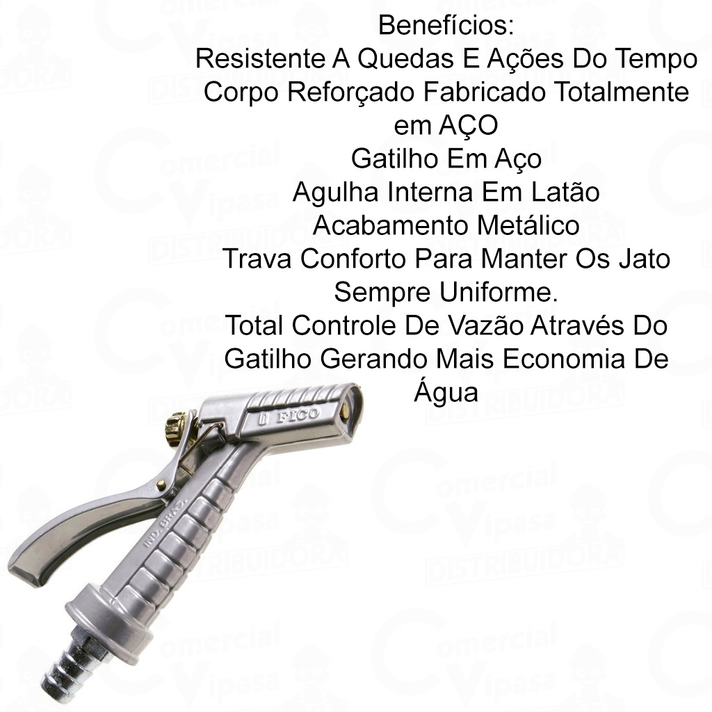 COMERCIAL VIPASA DISTRIBUIDORA. Esguicho Tipo Revólver Tradicional Para Mangueira De Jardim 1/2Pol. Metal Ferro Resistente ESGUICHO PARA MANGUEIRA JARDIM TIPO PISTOLA ROSCA DE 3/4" METAL ESGUICHO FICO TIPO PISTOLA METAL REGULAVEL PARA MANGUEIRA JARDIM ESGUICHO DE METAL REVÓLVER PARA REGAR JARDIM LAVAR ESGUICHO TIPO PISTOLA PARA MANGUEIRA DE JARDIM JATO REGULÁVEL O Esguicho Tradicional, confeccionado inteiramente em aço, proporciona um produto robusto, resistente e encorpado, garantindo qualidade e precisão em qualquer trabalho. Utilidade Cuidar do jardim, lavar calçadas, carros, quintais e etc. O esguicho tradicional também é COMPATÍVEL COM COMPRESSORAS DE AR. Benefícios: Resistente A Quedas E Ações Do Tempo Corpo Reforçado Fabricado Totalmente em AÇO Gatilho Em Aço Agulha Interna Em Latão Acabamento Metálico Trava Conforto Para Manter Os Jato Sempre Uniforme. Total Controle De Vazão Através Do Gatilho Gerando Mais Economia De Água. A LINHA FICO É SINÔNIMO DE QUALIDADE E DESEMPENHO. QUEM USA, SABE QUE ENCONTRA SEGURANÇA E DURABILIDADE. A FICO SE PREOCUPA COM O MEIO AMBIENTE COLOCANDO TECNOLOGIA E INOVAÇÃO EM CADA PRODUTO. Material Zamac e Aço Cor / Acabamentos Cromado Prata Medida 1/2 Polegada Esguicho Tipo Pistola Revólver de Metal para mangueiras de Jardim (encaixe 3/4) Conteúdo da embalagem: 1 (UM) Esguicho de Mangueira Para Jardim ( encaixe 1/2) 1 (UMA) Abraçadeira de Metal Para Mangueira Em busca da excelência, primamos pela satisfação total dos nossos clientes, tanto nos produtos quanto no atendimento, estabelecendo assim uma relação de confiança! Estamos sempre à disposição para tirar qualquer dúvida! COMERCIAL VIPASA DISTRIBUIDORA.
