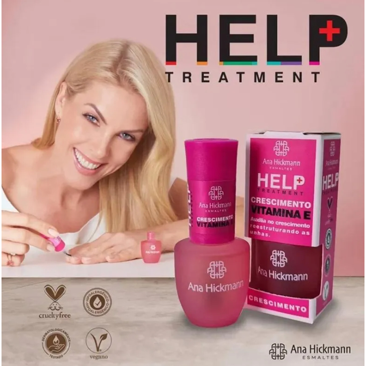 Esmalte Ana Hickmann Help Treatment Crescimento & Vitamina E 9 ml: base fortalecedora e nutritiva, com colágeno, biotina e vitamina E. Estimula crescimento saudável, hidrata unhas frágeis, é hipoalergênico, vegano e de secagem rápida. Ideal para uso diário.
