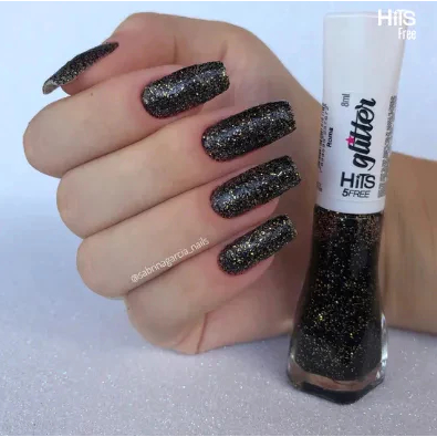 Esmalte Hits Glitter Roma Preto: cobertura intensa com glitter preto sofisticado e brilho multidimensional. Fórmula de alta fixação, secagem rápida e longa duração. Ideal para unhas elegantes e cheias de estilo, perfeito para looks noturnos e festivos.
