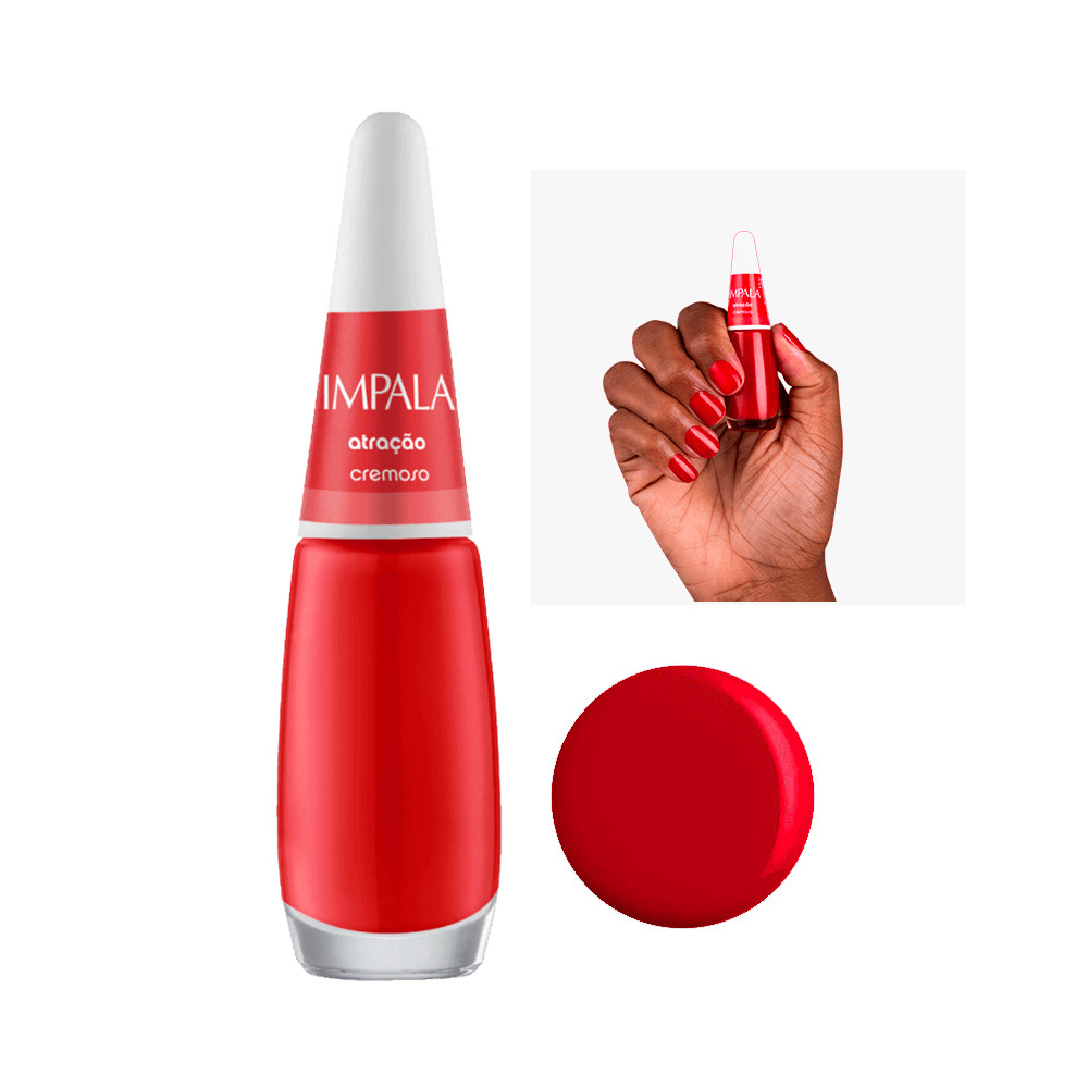 Esmalte Impala Cremoso Atração 8 ml Esmalte Impala Cremoso Atração em tom vermelho intenso, com acabamento cremoso e brilho vibrante. Fórmula hipoalergênica e pincel anatômico para aplicação precisa, oferecendo cor uniforme, secagem rápida e longa duração para unhas marcantes. Vermelho intenso e acabamento cremoso que realça as unhas com brilho uniforme. Pincel anatômico para aplicação precisa e cobertura uniforme. Modo de uso Prepare as unhas, aplique duas camadas do esmalte começando pelo centro e finalize com top coat para maior brilho e durabilidade. 1 Preparação Remova resíduos e limpe as unhas para melhor aderência do esmalte. 2 Primeira Camada Aplique a primeira camada iniciando pelo centro da unha para cobertura inicial. 3 Segunda Camada Passe a segunda camada para intensificar a cor e garantir durabilidade. 4 Finalização Finalize com top coat para proteger e prolongar o brilho. Características e benefícios O Esmalte Impala Atração combina cor vibrante, fórmula hipoalergênica e pincel anatômico para uma aplicação prática e acabamento impecável. Ideal para quem busca unhas com cor intensa, secagem rápida e resultado profissional no dia a dia. 1 Cor Vibrante Vermelho intenso que destaca as unhas com acabamento cremoso e brilho marcante. 2 Fórmula Hipoalergênica Desenvolvida para minimizar riscos de alergia, indicada para peles sensíveis. 3 Pincel Anatômico Aplicador que proporciona cobertura uniforme e aplicação sem falhas. 4 Longa Duração Secagem rápida e fórmula que mantém o esmalte bonito por mais tempo. Especificações Técnicas Impala Cremoso Vermelho intenso 8 ml Hipoalergênico Secagem rápida Pincel anatômico Close na textura cremosa e brilho intenso que evidencia a cobertura do produto. Sobre a marca Impala Impala é referência em esmaltes que unem inovação, cores atuais e qualidade para realçar a beleza das unhas com segurança. Qualidade de Processo Processos produtivos controlados garantem acabamento uniforme, segurança e consistência em cada frasco. Excelência em Produtos Fórmulas desenvolvidas para boa cobertura, durabilidade e conforto para diferentes perfis de consumidor. Compromisso Sustentável Adoção de práticas responsáveis e fórmulas pensadas para reduzir impactos ambientais.