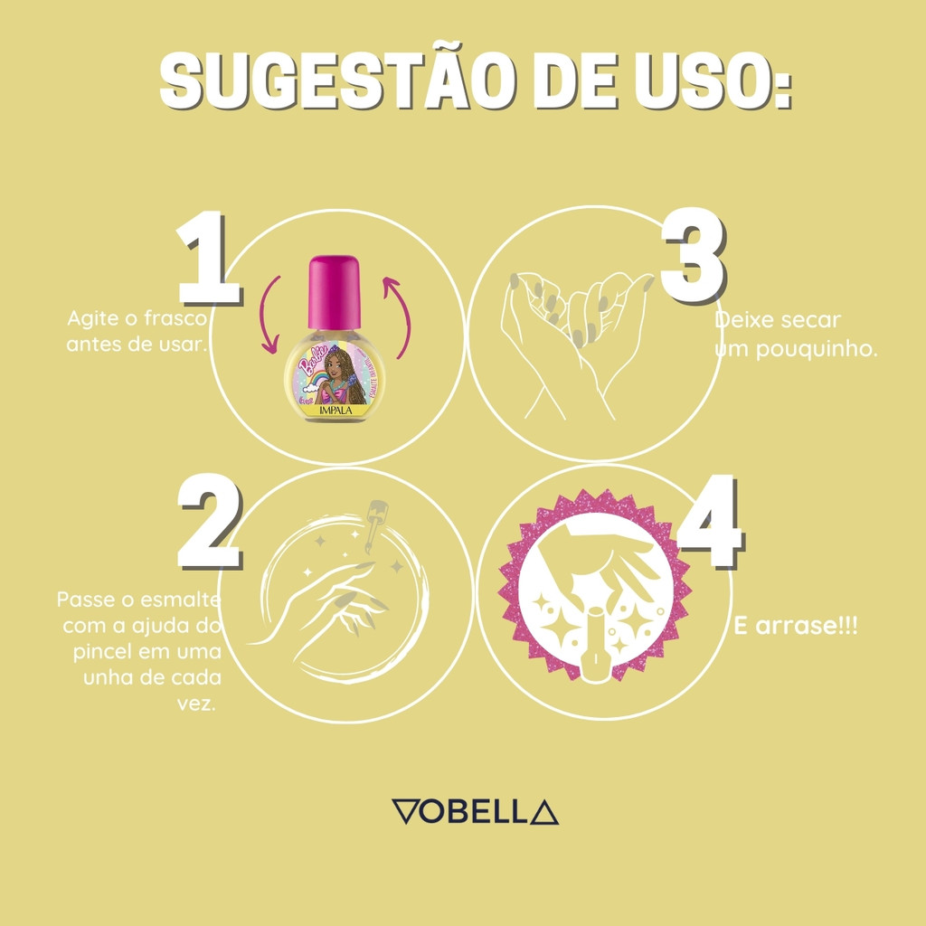 Oii, é um prazer ter você aqui! Está pronta para um toque de magia e cor nas suas unhas? O Esmalte Impala Infantil Barbie Além Do Arco-Íris Cremoso é a escolha perfeita para as pequenas que adoram se divertir com as cores e o universo encantado da Barbie! Com um tom cremoso encantador, esse esmalte traz um brilho incrível e é ideal para a primeira manicure das crianças, garantindo diversão e cuidado com as unhas. O que é: - Esmalte Impala Infantil Barbie Além Do Arco-Íris Cremoso. - Marca: Impala. - Linha: Barbie. O que tem: - Conteúdo: 6ml. - Vegano. - Alta cobertura. - Longa duração. - Brilho intenso. - Secagem rápida. - Não testado em animais. - Dermatologicamente testado. - Sai com Água de Sabão (infantil) O que faz: - Proporciona um acabamento cremoso e duradouro, perfeito para as pequenas se divertirem. - Sai com Água de Sabão, facilitando a aplicação e a remoção. - Oferece cores brilhantes que fazem a alegria das meninas. Indicado para: - Crianças que adoram esmaltes coloridos. Modo de uso: - Agite o frasquinho antes de usar. - Passe o esmalte em uma unha de cada vez com a ajuda do pincel. - Deixe secar um pouquinho e passe mais uma vez, para a cor ficar mais bonita. - Limpe os cantinhos, caso tenha borrado e pronto, está linda! - Sai com água e sabonete. Precauções de uso: - Não usar em crianças menores de 5 anos. - Usar sob a supervisão de adulto. - Não usar caso a pele dos dedos ou cutículas da criança estejam machucadas ou inflamadas. - Em caso de irritação, suspender o uso e procurar um médico. - Havendo contato com os olhos, enxaguar abundantemente com água. - Não ingerir. Não expor ao calor/luz solar. Conservar em local fresco. Os esmaltes infantis podem apresentar alteração de cor após secagem. Este produto não é um brinquedo. Experimente o Esmalte Impala Infantil Barbie Além Do Arco-Íris e deixe a diversão e as cores invadirem as unhas dela! Boas Compras :)