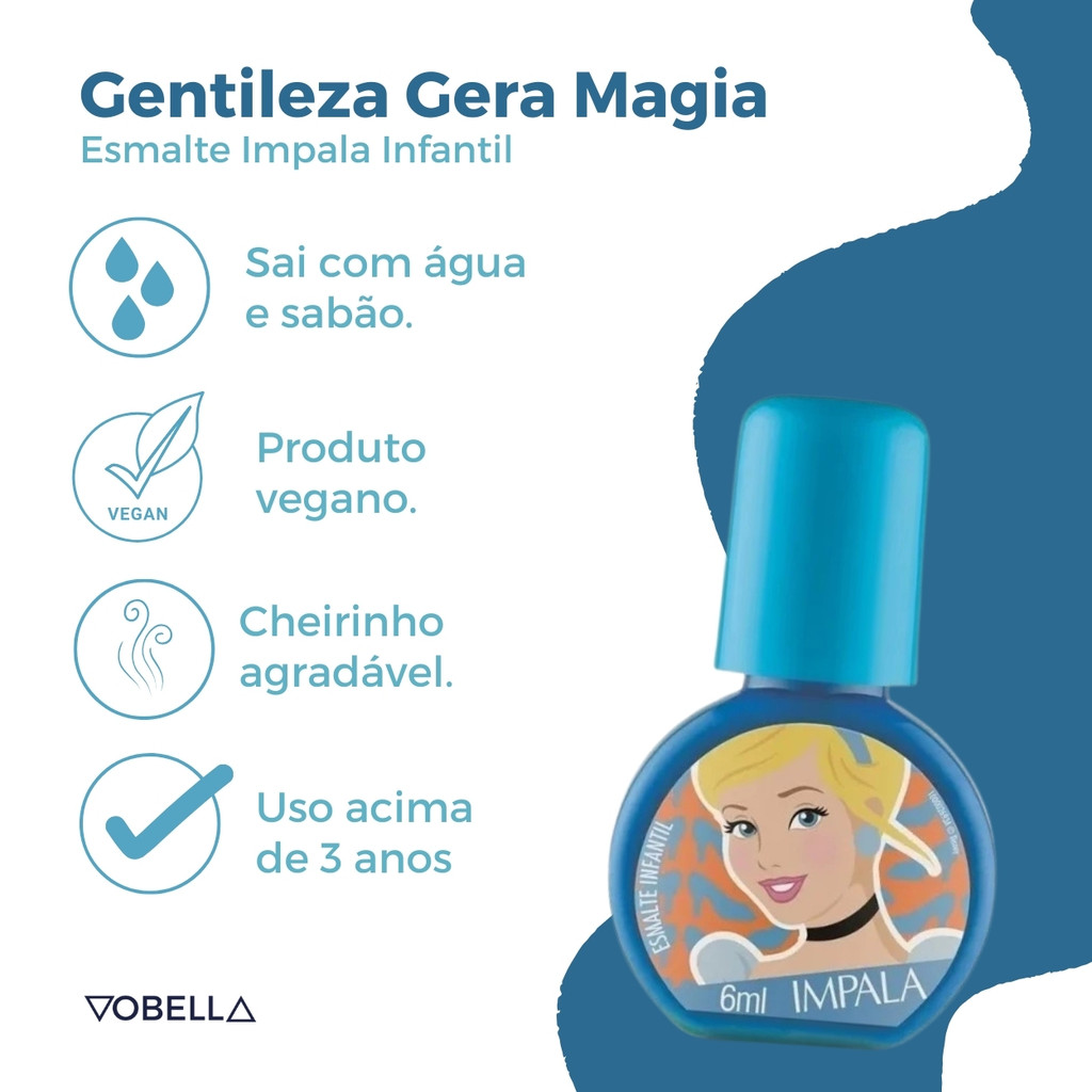 Oii, é um prazer ter você aqui! Que tal levar a magia da Disney para as unhas da sua pequena? O Esmalte Impala Infantil Princesa Cinderela Gentileza Disney é perfeito para transformar a manicure das meninas, inspirado na clássica Princesa Cinderela. Com uma fórmula segura e cor vibrante, esse esmalte traz o encanto da Disney diretamente para as unhas das pequenas, proporcionando diversão, brilho e muito estilo! O que é: - Esmalte Impala Infantil Princesa Cinderela Gentileza Disney. - Marca: Impala. - Linha: Princesas. O que tem: - Conteúdo: 6ml. - Vegano. - Alta cobertura. - Longa duração. - Brilho intenso. - Secagem rápida. - Hipoalergênico. - Não testado em animais. - Dermatologicamente testado. - Sai com Água de Sabão (infantil) O que faz: - Proporciona um acabamento cremoso e duradouro, para as pequenas se divertirem. - Sai com Água de Sabão, facilitando a aplicação e a remoção. - Oferece cores brilhantes que fazem a alegria das meninas. Indicado para: - Crianças que adoram esmaltes coloridos. Modo de uso: - Agite o frasquinho antes de usar. - Passe o esmalte em uma unha de cada vez com a ajuda do pincel. - Deixe secar um pouquinho e passe mais uma vez, para a cor ficar mais bonita. - Limpe os cantinhos, caso tenha borrado e pronto, está linda! - Sai com água e sabonete. Precauções de uso: - Não usar em crianças menores de 5 anos. - Usar sob a supervisão de adulto. - Não usar caso a pele dos dedos ou cutículas da criança estejam machucadas ou inflamadas. - Em caso de irritação, suspender o uso e procurar um médico. - Havendo contato com os olhos, enxaguar abundantemente com água. - Não ingerir. Não expor ao calor/luz solar. Conservar em local fresco. Os esmaltes infantis podem apresentar alteração de cor após secagem. Este produto não é um brinquedo. Que tal adicionar um toque encantado e cheio de brilho às unhas da sua pequena? Experimente o Esmalte Impala Infantil Princesa Cinderela e faça das unhas dela um verdadeiro conto de fadas! Boas Compras :)