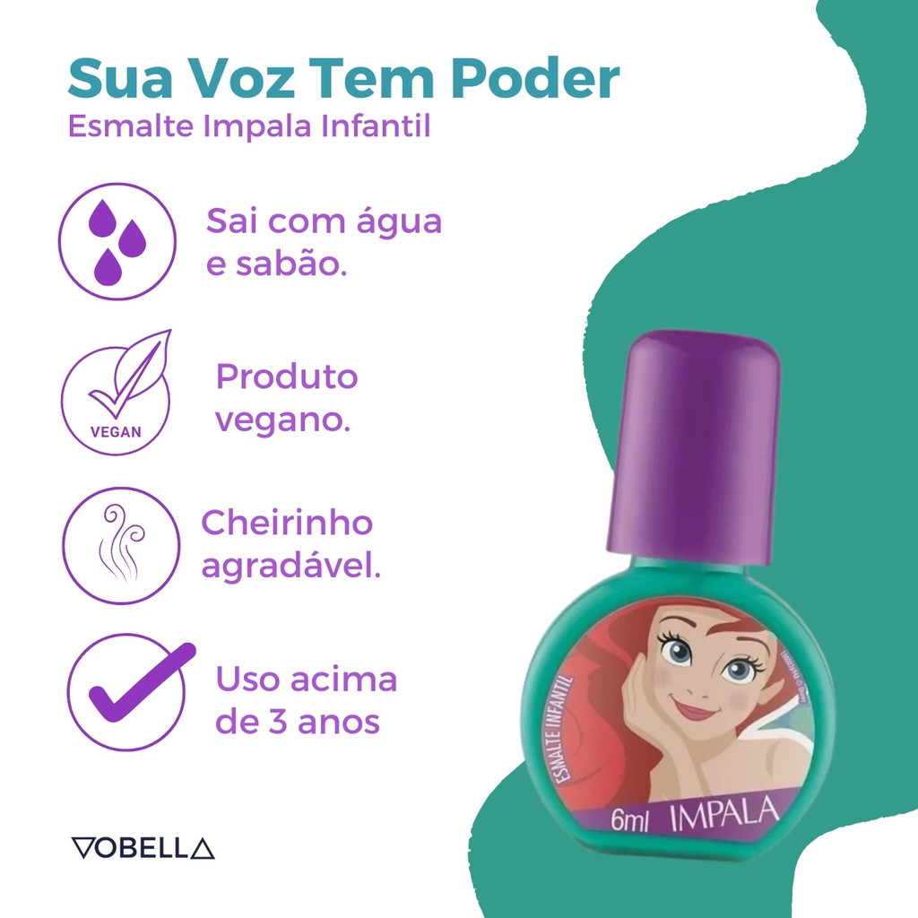 Oii, é um prazer ter você aqui! Pronta para mergulhar no mundo mágico de Ariel? O Esmalte Impala Kids Princesa Ariel Sua Voz Tem Poder Disney traz todo o brilho e encanto do oceano para as unhas da sua pequena. Inspirado na Princesa Ariel, este esmalte cremoso é perfeito para as meninas que adoram o universo de A Pequena Sereia, combinando magia e beleza em cada aplicação. O que é: - Esmalte Impala Kids Princesa Ariel Sua Voz Tem Poder Disney. - Marca: Impala. - Linha: Princesas. O que tem: - Conteúdo: 6ml. - Vegano. - Alta cobertura. - Longa duração. - Brilho intenso. - Secagem rápida. - Hipoalergênico. - Não testado em animais. - Dermatologicamente testado. - Sai com Água de Sabão (infantil) O que faz: - Proporciona um acabamento cremoso e duradouro, para as pequenas se divertirem. - Sai com Água de Sabão, facilitando a aplicação e a remoção. - Oferece cores brilhantes que fazem a alegria das meninas. Indicado para: - Crianças que adoram esmaltes coloridos. Modo de uso: - Agite o frasquinho antes de usar. - Passe o esmalte em uma unha de cada vez com a ajuda do pincel. - Deixe secar um pouquinho e passe mais uma vez, para a cor ficar mais bonita. - Limpe os cantinhos, caso tenha borrado e pronto, está linda! - Sai com água e sabonete. Precauções de uso: - Não usar em crianças menores de 5 anos. - Usar sob a supervisão de adulto. - Não usar caso a pele dos dedos ou cutículas da criança estejam machucadas ou inflamadas. - Em caso de irritação, suspender o uso e procurar um médico. - Havendo contato com os olhos, enxaguar abundantemente com água. - Não ingerir. Não expor ao calor/luz solar. Conservar em local fresco. Os esmaltes infantis podem apresentar alteração de cor após secagem. Este produto não é um brinquedo. Experimente o Esmalte Impala Kids Princesa Ariel e inspire a sua filha a brilhar com o poder de sua própria voz! Boas Compras :)