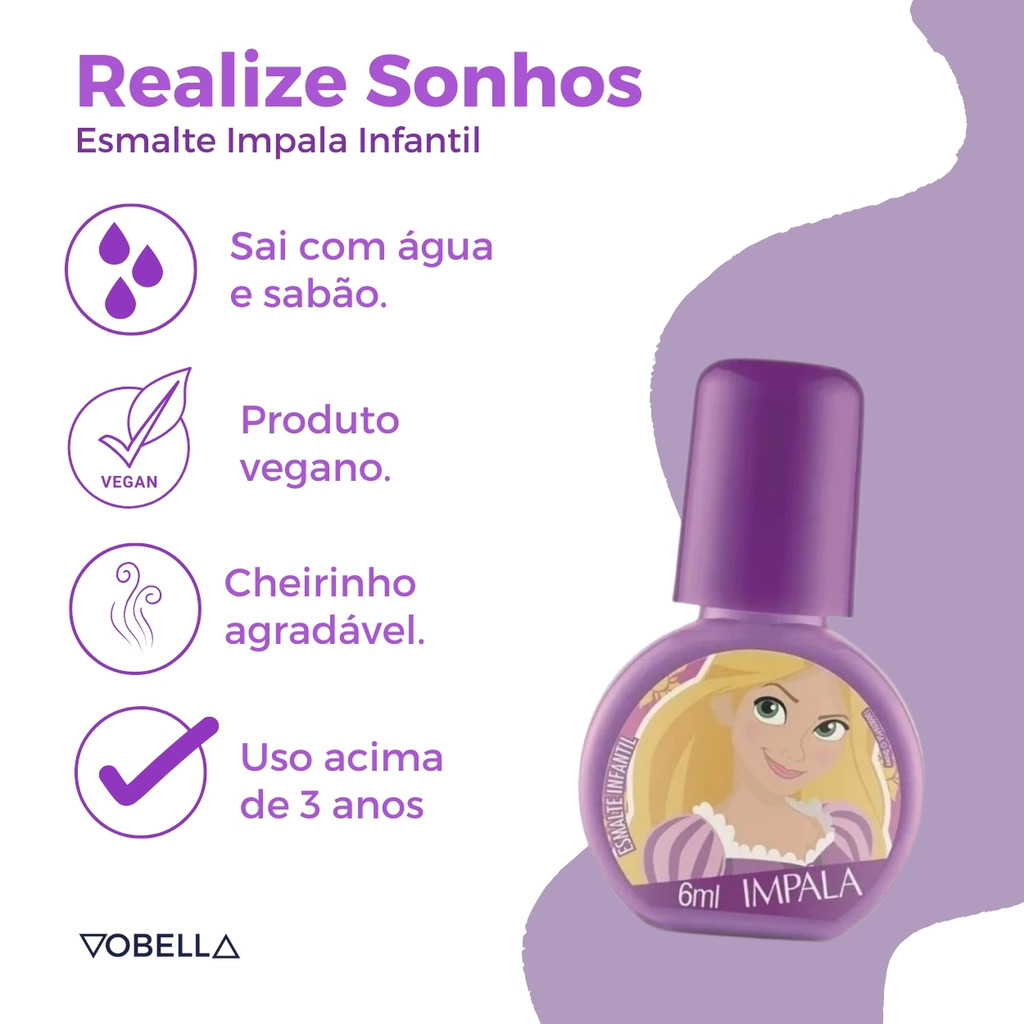 Oii, é um prazer ter você aqui! Pronta para adicionar um toque de magia e brilho às unhas da sua pequena? O Esmalte Impala Kids Princesa Rapunzel Realize Sonhos Disney traz toda a magia e a inspiração da princesa Rapunzel para as unhas das meninas. Com uma fórmula suave e segura, esse esmalte cremoso vai transformar cada manicure em uma verdadeira realização de sonhos, assim como a jornada de Rapunzel para alcançar seus desejos. O que é: - Esmalte Impala Kids Princesa Rapunzel Realize Sonhos Disney. - Marca: Impala. - Linha: Princesas. O que tem: - Conteúdo: 6ml. - Vegano. - Alta cobertura. - Longa duração. - Brilho intenso. - Secagem rápida. - Hipoalergênico. - Não testado em animais. - Dermatologicamente testado. - Sai com Água de Sabão (infantil) O que faz: - Proporciona um acabamento cremoso e duradouro, para as pequenas se divertirem. - Sai com Água de Sabão, facilitando a aplicação e a remoção. - Oferece cores brilhantes que fazem a alegria das meninas. Indicado para: - Crianças que adoram esmaltes coloridos. Modo de uso: - Agite o frasquinho antes de usar. - Passe o esmalte em uma unha de cada vez com a ajuda do pincel. - Deixe secar um pouquinho e passe mais uma vez, para a cor ficar mais bonita. - Limpe os cantinhos, caso tenha borrado e pronto, está linda! - Sai com água e sabonete. Precauções de uso: - Não usar em crianças menores de 5 anos. - Usar sob a supervisão de adulto. - Não usar caso a pele dos dedos ou cutículas da criança estejam machucadas ou inflamadas. - Em caso de irritação, suspender o uso e procurar um médico. - Havendo contato com os olhos, enxaguar abundantemente com água. - Não ingerir. Não expor ao calor/luz solar. Conservar em local fresco. Os esmaltes infantis podem apresentar alteração de cor após secagem. Este produto não é um brinquedo. Experimente o Esmalte Impala Kids Princesa Rapunzel e inspire a sua filha a brilhar e realizar todos os seus sonhos! Boas Compras :)