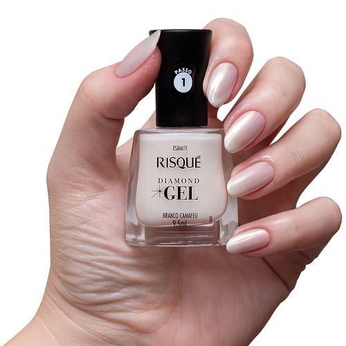 O Esmalte Risqué Diamond Gel Branco Camafeu tem uma leve cintilância na coloração, possui alto brilho e durabilidade.