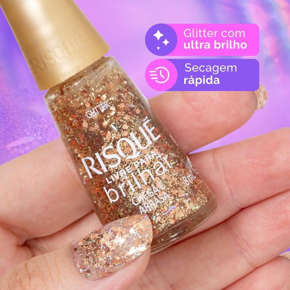 Esmalte Risqué Livre para Brilhar Glitter Dourado Chega e Arrasa 8ml
