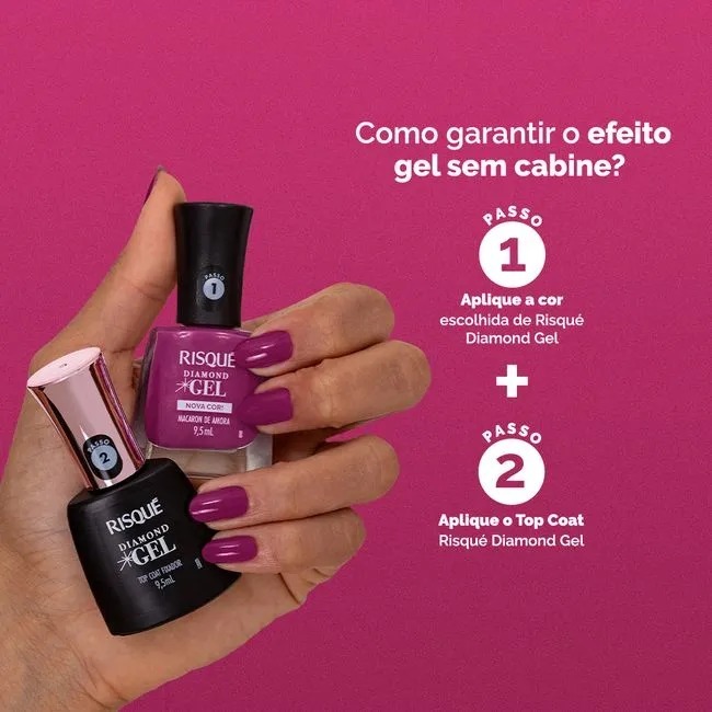 💜 Esmalte Roxo Risqué Diamond Gel – Macaron de Amora 9,5 ml O Risqué Diamond Gel Macaron de Amora é um tom de roxo sofisticado, moderno e vibrante, inspirado na doçura e elegância do tradicional doce francês. Ideal para quem ama unhas marcantes e femininas. Características principais Cor: Roxo médio a profundo, com toque elegante e moderna intensidade. Linha: Diamond Gel – linha premium com efeito de gel sem necessidade de cabine. Fórmula avançada: Alta cobertura, brilho máximo e longa duração. Acabamento: Ultrabranilhado e uniforme, com aparência de unhas de gel. Pincel profissional: 800 cerdas para aplicação precisa e sem falhas. Secagem: Natural, não precisa de cabine UV/LED. Hipoalergênico: Livre de tolueno, DBP e formaldeído. Benefícios Brilho espelhado por mais tempo. Alta pigmentação já nas primeiras camadas. Maior resistência a lascas quando finalizado com o Top Coat Diamond Gel. Cor elegante e versátil para qualquer estação. Modo de uso Aplique uma base, se desejar. Passe 1 a 2 camadas do Macaron de Amora. Finalize com o Top Coat Risqué Diamond Gel para ativar a tecnologia de longa duração. Deixe secar ao ar — sem cabine! Indicação Perfeito para quem ama tons roxos sofisticados. Combina com eventos, rotina e looks elegantes. Original - Envio Rápido com Nota Fiscal.
