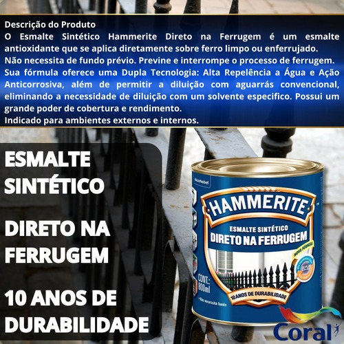 Esmalte Sintético Hammerite Direto Na Ferrugem 800ml Cores.....................................................................................................................................INFORMAÇÕES SOBRE O PRODUTOO Esmalte Sintético Hammerite Direto na Ferrugem é um esmalte antioxidante que se aplica diretamente sobre ferro limpo ou enferrujado. Não necessita de fundo prévio. Previne e interrompe o processo de ferrugem. Sua fórmula oferece uma Dupla Tecnologia: Alta Repelência a Água e Ação Anticorrosiva, além de permitir a diluição com aguarrás convencional, eliminando a necessidade de diluição com um solvente especifico. Possui um grande poder de cobertura e rendimento. Indicado para ambientes externos e internos......................................................................................................................................-Especificações: Rendimento: 10 m²/LTempo de secagem:Ao toque: 1h a 2 hrsEntre demãos: 8hrsFinal: 18 hrsNúmero de demãos:-3.....................................................................................................................................LOJAO grupo SOLUWAN atua neste mercado há mais de 30 anos, possuindo loja física e online.Com 30 anos de história procuramos atender nossos clientes com agilidade, competência, ética e honestidade.Vendemos somente produtos novos e de qualidade garantida.Despachamos em até 24 horas.Entregamos para todo o Brasil......................................................................................................................................DÚVIDAS FREQUENTES.....................................................................................................................................Pergunta: Como é embalado o produto?Resposta: Todos os nossos produtos vendidos são embalados em caixas lacradas ou plástico stretch. Em respeito ao meio ambiente 90% das caixas são reutilizadas.Pergunta: Quem faz a entrega?Resposta: A entrega é terceirizada, feita via CORREIOS ou TRANSPORTADORA.Pergunta: O envio é feito em quantos dias?Resposta: Nós enviamos o seu pedido no prazo máximo de 24 horas após a confirmação de sua compra, sendo um dos envios mais rápidos da plataforma.Pergunta: Os produtos são novos ou usados?Resposta: Todos os produtos que trabalhamos são novos e com qualidade garantida......................................................................................................................................#tintasuvinil #hammerite #esmalte #ferrugem #esmalteparaferrugem #esmalte800ml #QualidadeGarantida #ProdutoComNotaFiscal #EnvioImediato #ProdutoOriginal #MelhorPreço