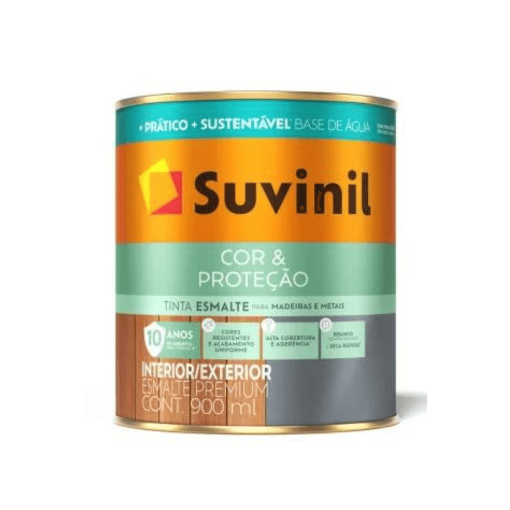 Suvinil Esmalte Cor e Proteção Brilhante Base Água. Suvinil Esmalte Cor e Proteção permite pintar e fechar portas e janelas no mesmo dia. A tinta não necessita de aguarrás para diluição e as ferramentas utilizadas podem ser lavadas com água. ACABAMENTO: -Brilhante DESCRIÇÃO: -Esmalte à base de água de secagem rápida, fácil aplicação, bom alastramento e boa aderência para multimetais e madeira. INDICAÇÃO: -Indicado para embelezar e proteger superfícies internas e externas de madeiras, metais ferrosos, galvanizados, alumínio e PVC. BENEFÍCIOS: -Seca em 30 min. ao toque -Permite pintar e fechar suas portas e janelas no mesmo dia. -Sem cheiro e não amarela -Você pode retomar suas atividades muito mais rápido. SECAGEM: -2 a 3 demãos -Ao toque 30 minutos -Entre demãos: 2 horas -Final: 5 horas EMBALAGEM/RENDIMENTO (m2/demão): -Quarto (900ml): Em torno de 20m2