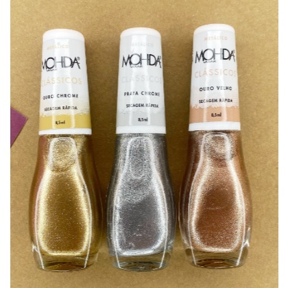 | Esmaltes Metalizados Mohda - OURO CHROME + OURO VELHO + PRATA CHROME este produto | R$ 29,99 | — | 4.9/5 | 10 |