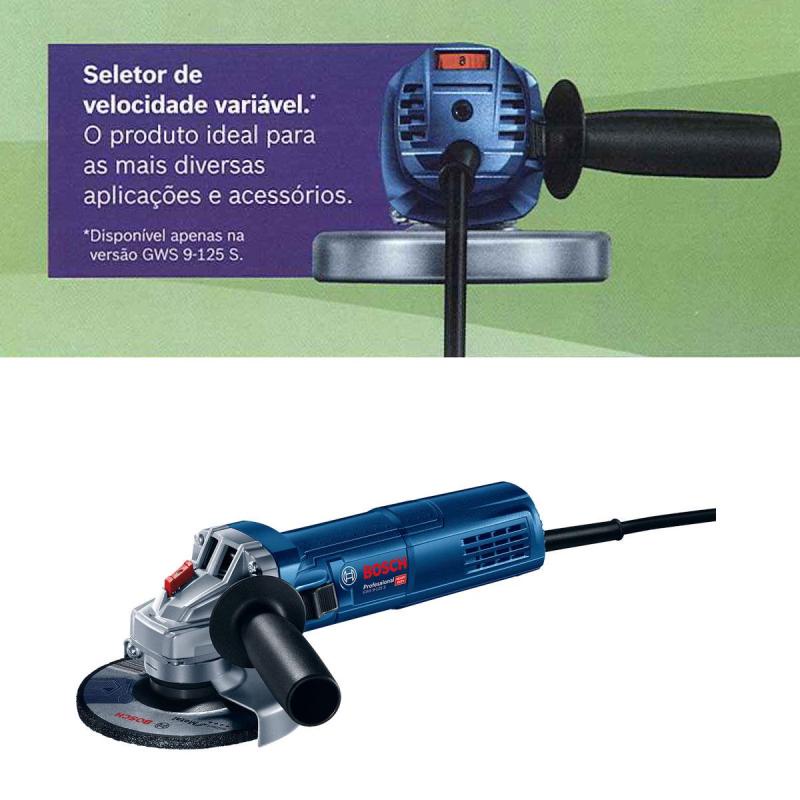 Esmerilhadeira Angular 5 POL 900W Gws 9-125 S com Controle de Velocidade BOSCH Motor de 900W, perfeito para os trabalhos mais pesados e os usuários mais exigentes.A máquina mais leve da categoria com melhor ergonomia para o usuário e versátilidade de uso atravéz do seletor de velocidade variável.Corte, desbaste, lixamento, acabamento, remoção de material em metais e concreto. 1,7Kg motor slim de 900w, carcaça de engrenagens compacta e velocidade variável. VANTAGENS:Novo motor de 900W com alto desempenho e torque.Design ergonômico para fácil manuseio e controle.Flange metálica para maior durabilidade e robustez mesmo sobcarga pesada.Desempenho superior ao esmerilhar/cortar devido à alta potência e torque a 900 WControle manual melhor da categoria devido ao tamanho da empunhadeira adequado para a palma da mão e design ergonômicoLonga vida útil sob condições de trabalho desfavoráveis e trabalhos de carga pesada, devido ao design e componentes robustosVárias aplicações e acessórios devido à função de pré-seleção de velocidade2 Anos de Garantia CARACTERÍSTICAS:Diâmetro do disco: 125mmPeso: 1,9kgPotência: 900WVoltagem: 127V OU 220V (não é bivolt)Rotação: 2.800 - 11.000 RPMTamanho do Punho: M14; 5/8"Rosca do eixo: 59*54,5 mmInterruptor: Dois sentidos Valores totais de vibração (Desbastar superfícies (ásperas))Valor de emissão de vibrações ah: 7,5 m/s²Incerteza K: 1,5 m/s² Dimensão da Embalagem: 120x120x360 mm Conteúdo da Embalagem:1 Esmerilhadeira,1 Empunhadeira Auxiliar,1 Flange,1 O-Ring,1 Porca Redonda,1 Chave de Pinos * Imagens meramente ilustrativas.