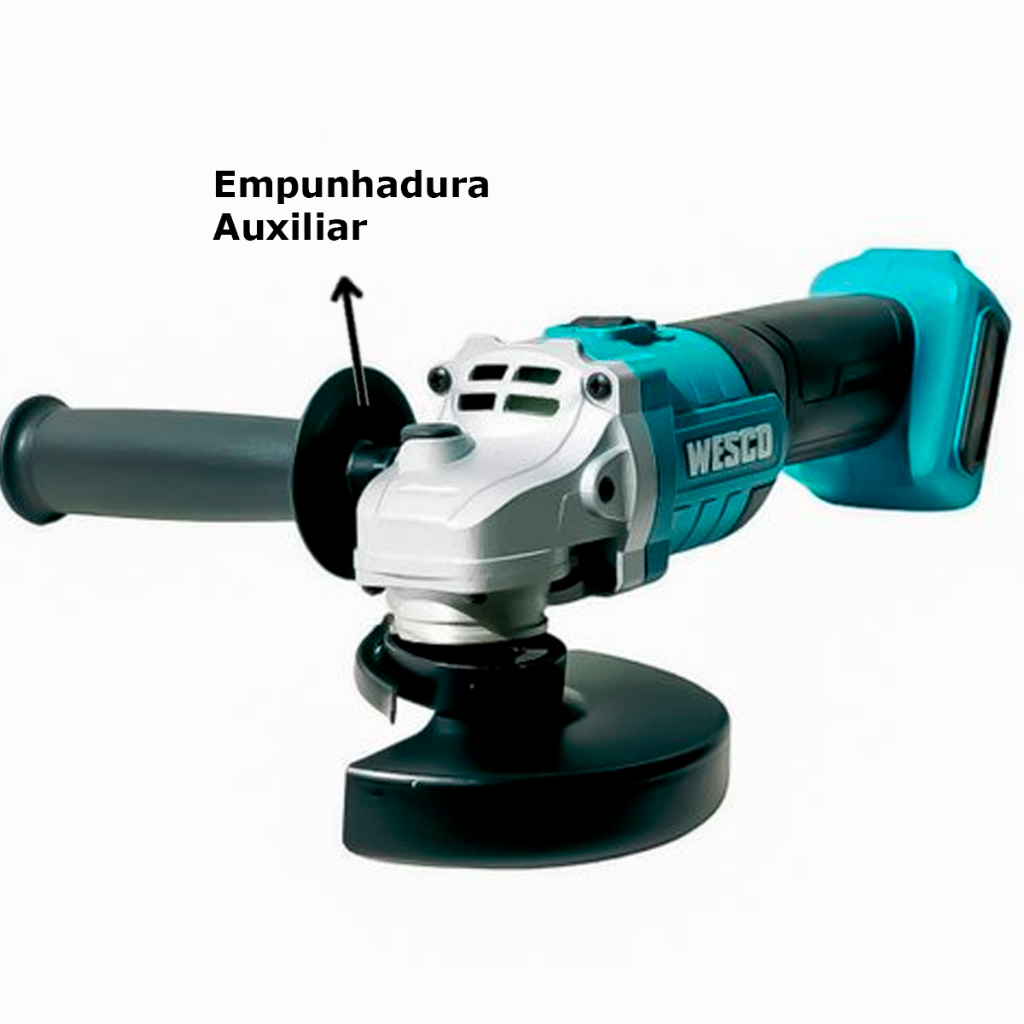 COMERCIAL VIPASA DISTRIBUIDORA. Esmerilhadeira Angular Portátil 18V 4.1/2 Pol. 115mm Profissional (NÃO ACOMPANHA BATERIA) WS2890K Lixadeira Esmerilhadeira Angular Portátil 18V 4.1/2 Pol. 115mm Profissional Sem Bateria - WESCO Lixadeira Esmerilhadeira Angular Portátil 18V 4.1/2 Pol. 115mm Profissional Sem Bateria BATERIA NÃO INCLUSA ESMERILHADEIRA ANGULAR A BATERIA 18V 4.1/2 POL 115MM - SEM BATERIA / W . Descrição Esmerilhadeira Angular 4.1/2 Pol a Bateria WS2941.9 WESCO *Não acompanha carregador. Não acompanha bateria. DADOS TÉCNICOS: Modelo: WS2941.9 Marca: Wesco Bateria: 18V (Não acompanha). Rotação: 8.800 rpm. Diâmetro do disco: 115 mm. Furo do disco: 22,2 mm. Rosca do Eixo: M14. Peso: 1,4 Kg ACOMPANHA: 1 Empunhadura auxiliar. 1 Capa de proteção. 1 Chave de pino. Carcaça em Alumínio: Carcaça de engrenagem em alumínio. Empunhadura: 2 posições da empunhadura auxiliar. Ajuste Rápido: Capa de proteção com ajuste rápido de presilha. Gatilho Deslizante: Gatilho lateral deslizante, fácil manuseio. Proteção da Bateria: Bateria possui placa mãe com proteção contra sobrecarga ou sobreaquecimento quando em uso.(Não acompanha bateria). Saída de Ar: Entradas e saídas de ar otimizadas, para melhor resfriamento do motor Design Ergonômico: Design ergonômico e corpo emborrachado. Carcaça de Alumínio: Carcaça de engrenagem em alumínio, para maior durabilidade da ferramenta e design compacto, para acesso em locais estreitos. Ajuste Rápido: Capa de proteção com ajuste rápido por presilha. Fácil e rápido posicionamento da capa, para maior segurança do usuário durante operação de trabalho. Design Ergonômico: Corpo principal com design ergonômico e emborrachado, para fácil manuseio da ferramenta. Gatilho lateral que facilita o acionamento com apenas uma mão. Empunhadura: Empunhadura auxiliar com 2 posições de uso, facilidade para destros e canhotos durante operação da ferramenta *Imagens ilustrativas Garantia de 1 Ano pelo Fabricante COMERCIAL VIPASA DISTRIBUIDORA.