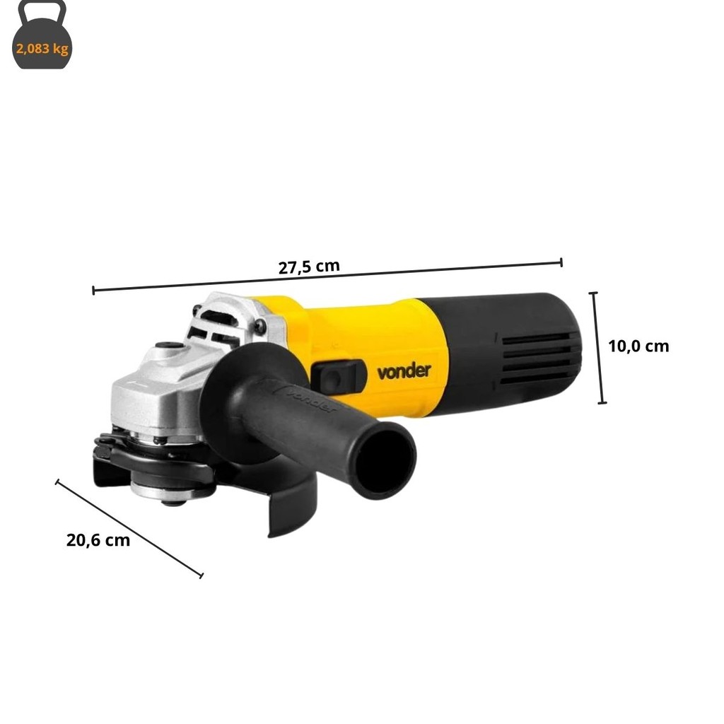 Conteúdos na Embalagem - 01 Esmerilhadeira angular - 01 capa de proteção com trava de ajuste rápido - 01 Punho auxiliar - 01 chave 2 pinos Atributos e Benefícios: - Potência de 900 W: Garante alto desempenho em cortes, lixamentos e polimentos. - Velocidade variável em 6 níveis: Permite ajustes de rotação de 2.800 a 11.000 rpm, adaptando-se a diferentes aplicações. - Disco de 5" (125 mm): Compatível com diversos acessórios para múltiplas funções. - Rosca do eixo M14: Facilita a troca de discos e acessórios. - Punho auxiliar com 2 posições: Oferece maior controle e conforto durante o uso. - Empunhadura ergonômica: Proporciona melhor aderência e reduz a fadiga. - Botão de trava do eixo: Simplifica a substituição dos discos. - Interruptor com trava de segurança: Evita acionamentos acidentais, aumentando a segurança. - Dupla isolação: Maior proteção contra choques elétricos. - Acompanha capa de proteção com ajuste rápido: Maior segurança e praticidade na operação. - Inclui chave de 2 pinos: Facilita a manutenção e troca de acessórios. Ficha Técnica: - Modelo: EAV 905V - Potência: 900 W - Capacidade da esmerilhadeira (disco): 5" - 125 mm - Rosca do eixo: M14 - Tipo de velocidade: Variável - Niveis de Velocidade: 6 - Rotação (rpm): 2.800/min a 11.000/min. N°1: 2.800/min; N°2: 4.000/min; N°3: 5.400/min; N°4: 7.000/min; N°5: 8.800/min; N°6: 11.000/min - Ajuste do cabo da esmerilhadeira: Fixo - Número de posições de ajuste do punho: 2 posições - Segue norma: ABNT NBR IEC 60745-1 e ABNT NBR IEC 60745-2-3 - Tensão (V): 110V / 220V (Verificar disponibilidade no anúncio) - Frequência: 50 Hz / 60 Hz - Aceleração transmitida nas mãos - braços do operador - ah: 4,32 m/s² - Incerteza da aceleração transmitida nas mãos - braços do operador - k: 1,5 m/s² Dimensões e Peso: - Dimensões do Produto com embalagem: COMP. x LARG. x ALT.: 34,0 x 11,8 x 12,4 cm - Peso Bruto: 2,30 kg - Dimensões do Produto: COMP. x LARG. x ALT.: 27,5 x 20,6 x 10,0 cm - Peso Liquido: 2,083 kg Garantia Legal: - 90 dias + Garantia contratual: 9 meses (Para locadoras, garantia única e exclusiva de 90 dias) A Esmerilhadeira Angular 5" 900W Velocidade Variável EAV 905V Vonder é a escolha ideal para profissionais e entusiastas que buscam uma ferramenta versátil e eficiente. Com potência de 900 W e velocidade ajustável em 6 níveis, adapta-se a diversas tarefas como cortes, lixamentos e polimentos em metais e outros materiais. Seu design ergonômico, aliado ao punho auxiliar com duas posições, proporciona conforto e controle durante o uso. Além disso, recursos como a trava de segurança e a dupla isolação garantem operações mais seguras. Um equipamento robusto e confiável para atender às demandas do dia a dia.