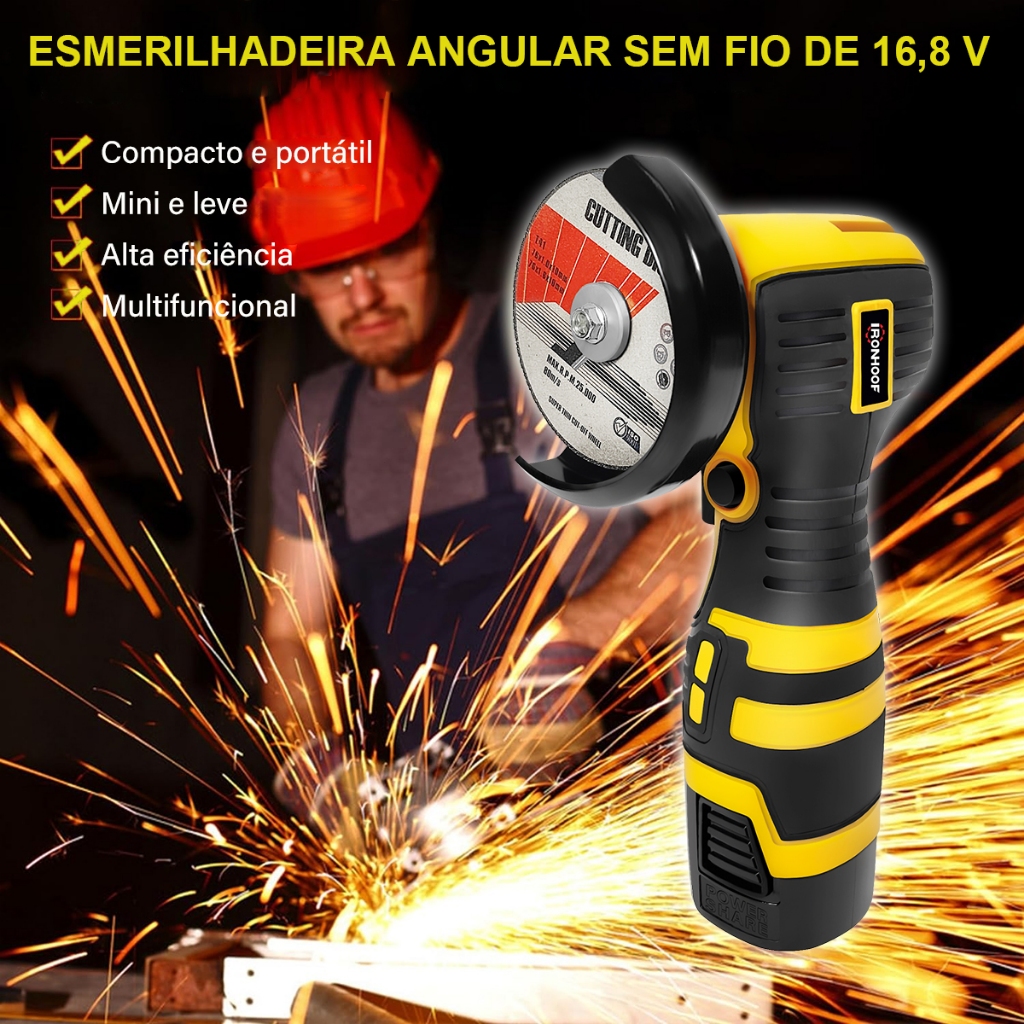 IRONHOOF Esmerilhadeira Angular Mini 16.8V 75mm - Projetada para profissionais, realiza cortes precisos em espaços confinados com eficiência. Engrenagens de precisão e design sem fio, atinge incríveis 28.000 RPM, potência de 550W, e inclui 2 baterias de alta performance para maior autonomia. Peso ultra leve: apenas 1,2kg. —————8 VANTAGENS PRINCIPAIS————— - Motor sem escova de cobre puro - Alta eficiência, potência extrema (28.000 RPM), baixa vibração e vida longa - Baterias de lítio de alta capacidade - 16,8V oferece mais energia e duração que baterias 12V - Design compacto - Operação precisa em espaços apertados - Cabo ergonômico antiderrapante - Conforto prolongado sem fadiga - Dupla proteção - Sistema contra sobrecarga + trava de segurança - Freio instantâneo - Para totalmente em 1 segundo após desligar - Multimaterial - Corta aço, tubos, azulejos e mais - Baixo ruído - Apenas 76 dB (operações mais silenciosas) —————ESPECIFICAÇÕES TÉCNICAS————— - Marca: IRONHOOF - Cores: Vermelho/Amarelo - Fonte de energia: Bateria recarregável - Voltagem: 16,8V - Potência: 550W - Diâmetro de corte: 16mm - Tipo de motor: Motor sem escova de cobre puro - Velocidade máxima: 28.000 RPM - Nível de ruído: 76 dB - Disco de corte: 75mm - Furo interno: 10mm - Rosca do eixo: M5 - Tempo de carga: 1-2 horas - Autonomia: 30-40 minutos —————CONTEÚDO DA EMBALAGEM————— - 1× Esmerilhadeira angular sem fio - 2× Baterias 16,8V - 5× Disco de Corte - 1× Carregador - 1× Chave L - 1× Manual - 1× Luva de proteção - 1× Caixa de ferramentas APLICAÇÕES:Manutenção doméstica/Usinagem de metais/Reformas e construção/Projetos DIY Recomendação: Carregue totalmente antes do primeiro uso.