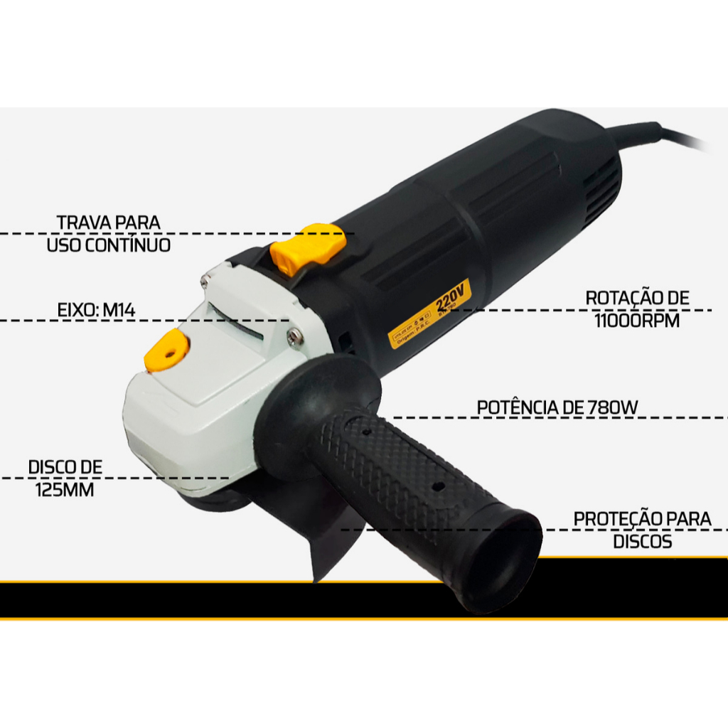 Distribuído por Ismafer Ferramentas VOLTAGEM 127V OU 220V (ESCOLHA SUA VOLTAGEM) ESMERILHADEIRA ANGULAR 4.1/2"(125MM) 780W 11000RPM BTA780 A Esmerilhadeira Angular 4.1/2" BTA780, é destinada para uso em operações de esmerilhamento e corte, ideal para o desbaste em peças metálicas , acabamentos sobre soldas, remoção de rebarbas de peças fundidas, limpeza de superfícies enferrujadas ou com tinta; Possui ótima ergonomia, punho auxiliar e um motor potente de 780W. OBSERVAÇÃO: - Não utilizar o produto em madeiras, alta rotação do produto. VANTAGENS: - Possui trava para uso contínuo, permitindo a utilização de maneira contínua sem a necessidade de pressionar o gatilho; - Empunhadura lateral: Maior conforto e segurança na hora de trabalho. CARACTERÍSTICAS: - Utilizada para cortes e desbastes em metais, aço e ferro. FICHA TÉCNICA: - Capacidade do disco: Até 125mm; - Rotação: 11000 RPM; - Potência: 780W; ITENS INCLUSOS: - 01 Chave de porca para fixação; - 01 Esmerilhadeira Angular; - 01 Punho auxiliar; - 01 Manual usuário. Modelo: BTA780 Garantia: 06 Meses SKU: 23142 Distribuído por Ismafer Ferramentas