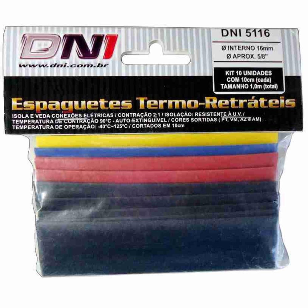 O Kit DNI vem com 10 unidades de espaguetes termo - retráteis para uso em<br>emendas de fios, chicotes, terminais, carregadores de celular, conectores em geral.<br>Isola e veda conexões elétricas, evitando a umidade e oxidação.<br><br> O Kit é composto por espaguetes coloridos, auxiliando nas identificações dos cabeamentos.<br><br>Ficha Técnica<br><br>Temperatura de contração: 90ºC<br>Contração: 2:1<br>Auto extinguível e resistente a U.V<br>Diâmetro interno: Ø 16mm<br>Diâmetro aproximado (pol): Ø5/8"<br>Material: Poliolefina flexível<br><br>Medida: 0,1cm ( unidade)<br>Medida total: 1,0m