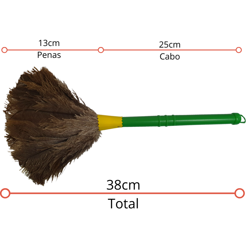 Produto: Contém 1 Espanador Composto por Plumas de Avestruz. (MEDIDAS: CABO: 25CM / PENAS: 13CM) Tamanho total do espanador 38CM. Materiais do cabo: Madeira plástificada e Aço. Indicações para Limpeza: Tira pó Móveis, Carros, Computadores, Locais com difícil acesso: prateleiras de lojas, vitrines, limpezas de peças de cristal, lustres, etc. Observação: Como se trata de um produto com penas naturais de avestruz, pode haver variação de até 2 cm para mais ou para menos no tamanho total do espanador.