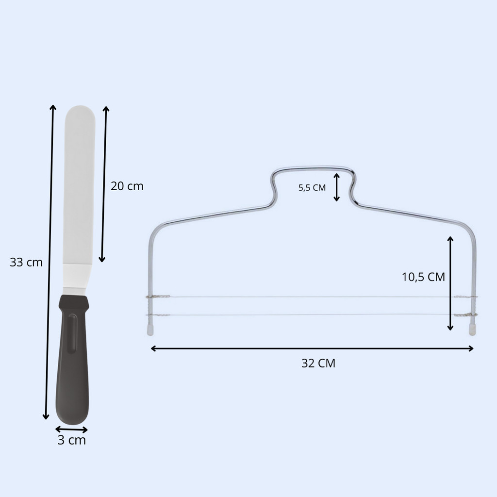 CORTADOR + ESPÁTULA ANGULAR O kit contém: 01 CORTADOR NIVELADOR FIO DUPLO Comprimento: 32 cm Altura: 16cm Material: Aço inox 01- ESPÁTULA ANGULAR Material: Aço inoxidável com cabo de plástico ou madeira Dimensões: 32 cm x 3 cm x 19,9 cm Ganhe tempo e eficiência na sua confeitaria com esses utensílios essenciais! Por que comprar conosco? ✔ Envio rápido: Postagem em até 24 horas úteis após a confirmação do pagamento. Dependendo do horário da compra, o envio pode ser feito no mesmo dia. ✔ Qualidade garantida: Trabalhamos apenas com produtos de alta qualidade e pronta entrega. ✔ Embalagem segura: Todos os produtos são cuidadosamente embalados para garantir que cheguem em perfeito estado. ✔ Atendimento ágil e personalizado: Estamos prontos para esclarecer dúvidas e resolver qualquer problema rapidamente. ✔ Compra 100% segura: Seguimos todos os protocolos para garantir a segurança da sua compra. Ainda tem dúvidas? Fique à vontade para perguntar!