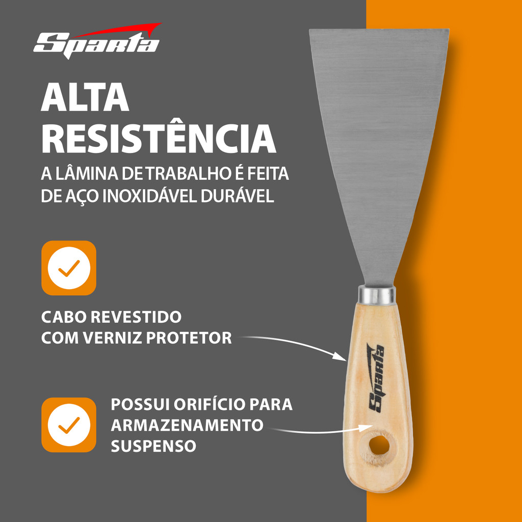Espátula Sparta 8521255 com Lâmina de Aço Inoxidável (60 mm): A espátula Sparta 8521255, com parte de trabalho em aço inoxidável de 60 mm de largura e cabo de madeira, é uma ferramenta essencial para aplicar, nivelar e alisar misturas de construção. Ideal para uso em trabalhos de reparação e acabamento em casa, essa espátula oferece praticidade e eficiência em diversos tipos de projetos de manutenção e reparo. Vantagens da Espátula Sparta 8521255: Durabilidade e Resistência à Corrosão: A lâmina de aço inoxidável proporciona alta durabilidade e resistência à corrosão, mantendo a espátula em ótimo estado mesmo após uso constante em ambientes exigentes. Conforto no Trabalho: O cabo de madeira garante uma pegada confortável, permitindo que o usuário trabalhe por longos períodos sem sentir desconforto nas mãos. Versatilidade: A borda afiada da lâmina facilita a remoção rápida de ferrugem das superfícies, além de ser eficaz para a aplicação e nivelamento de misturas de construção e pequenas tarefas de manutenção. Largura de 6 cm: Com 60 mm de largura, a espátula Sparta 8521255 é ideal para trabalhar em locais de difícil acesso, proporcionando precisão e controle em áreas apertadas ou de difícil manuseio. Longevidade: O cabo de madeira é revestido com verniz incolor, oferecendo proteção contra rachaduras e aumentando a durabilidade da ferramenta. Além disso, o cabo está firmemente conectado à parte de trabalho, garantindo segurança durante o uso. Armazenamento Suspenso: A espátula Sparta 8521255 possui um orifício no cabo, facilitando o armazenamento suspenso e a secagem rápida após o uso, mantendo a ferramenta sempre pronta para o próximo trabalho. A espátula Sparta 8521255 é a escolha ideal para quem busca eficiência, durabilidade e conforto em trabalhos de reparação e acabamento em casa. Sua construção robusta e design ergonômico a tornam indispensável em qualquer caixa de ferramentas para tarefas de manutenção e aplicação de misturas de construção.