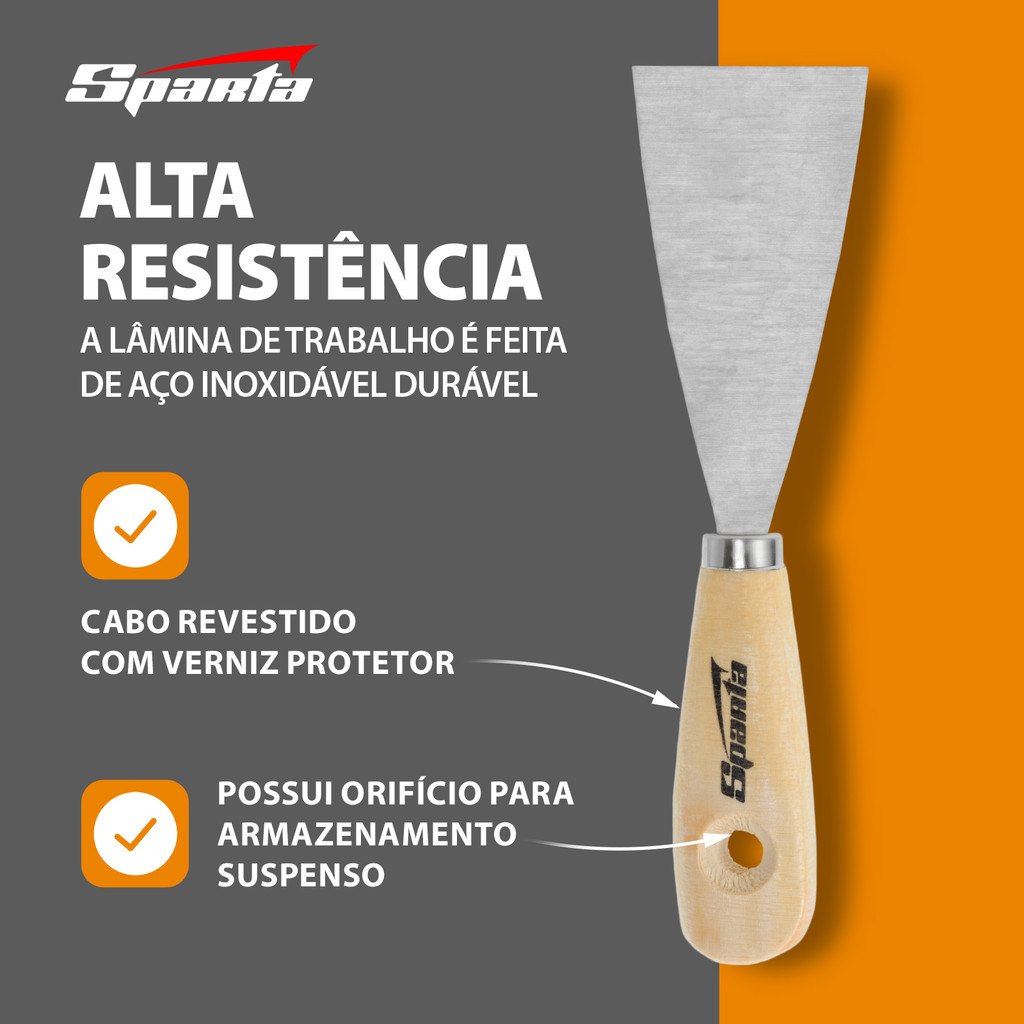 Vantagens da Espátula Sparta 8520955: Durabilidade e Resistência à Corrosão: A lâmina de aço inoxidável proporciona alta durabilidade e resistência à corrosão, garantindo que a ferramenta tenha longa vida útil, mesmo sob uso contínuo em ambientes de trabalho exigentes. Conforto no Trabalho: O cabo de madeira oferece uma pegada confortável, permitindo ao usuário trabalhar por longos períodos sem desconforto nas mãos. Versatilidade: A borda afiada da lâmina facilita a remoção rápida de ferrugem das superfícies, tornando-a útil não apenas para aplicar e nivelar misturas de construção, mas também para pequenas tarefas de manutenção e reparo. Largura de 5 cm: Com 50 mm de largura, a espátula Sparta 8520955 é ideal para trabalhar em espaços confinados e locais de difícil acesso, proporcionando maior precisão e controle. Longevidade: O cabo de madeira é revestido com verniz incolor, oferecendo proteção contra rachaduras e danos, enquanto está firmemente conectado à parte de trabalho, garantindo maior resistência e segurança. Armazenamento Suspenso: A espátula Sparta 8520955 possui um furo no cabo, tornando-a prática para pendurar e secar após o uso, facilitando o armazenamento e mantendo a ferramenta sempre pronta para o próximo uso. A espátula Sparta 8520955 é a ferramenta perfeita para quem busca durabilidade, versatilidade e conforto em trabalhos de reparo, acabamento e aplicação de misturas de construção. Sua construção resistente e ergonomia tornam-na indispensável em qualquer caixa de ferramentas.