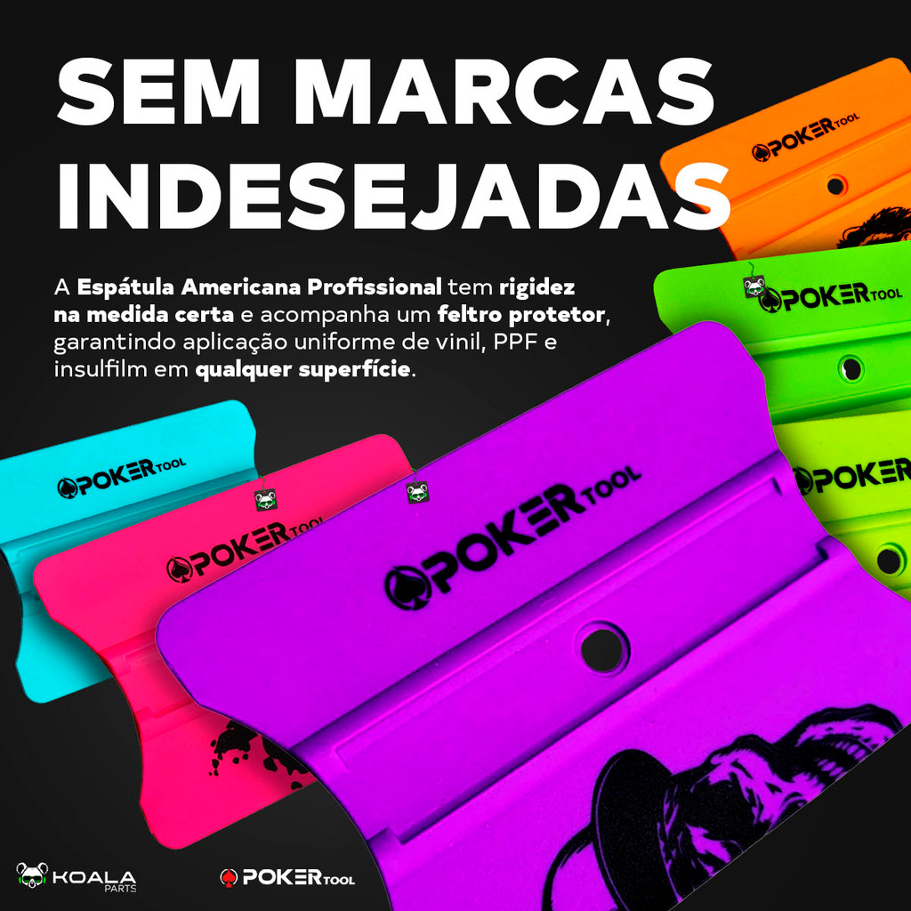 Espátula Americana Profissional com Feltro — Poker Tool >> Cores: Azul, Laranja, Rosa, Roxo, Verde Limão e Verde Neon SEM MARCAS INDESEJADAS! A Espátula Americana Profissional Poker Tool combina rigidez na medida certa e acompanha feltro protetor adesivo, garantindo aplicação uniforme de vinil, PPF e insulfilm em qualquer superfície — sem marcas indesejadas. - Design clássico e ergonômico - Frisos centrais para maior firmeza e controle - Bordas arredondadas para deslize suave - Feltro adesivo que evita riscos no material - Cores fluorescentes exclusivas Poker Tool Benefícios: 1. Aplicação uniforme e rápida 2. Proteção contra riscos e arranhões 3. Mais conforto e firmeza durante o uso 4. Acabamento limpo e profissional em menos tempo Enviamos bem embalado, super rápido e com garantia de originalidade. Garanta o seu e confira os outros produtos da nossa Loja Koala Parts. Especificações Técnicas: Material: Plástico rígido Formato: Retangular (Americana) Medidas: 10x7cm Conteúdo da Embalagem: 1 Espátula Americana Poker Tool 1 Feltro adesivo protetor