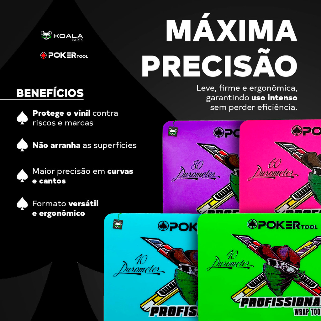 Espátula Profissional Poker Flop - Poker Tool >> Durezas/Cores: 40 Azul, 40 Verde, 60 Rosa e 80 Roxa PRECISÃO E MACIEZ EM QUALQUER APLICAÇÃO! A Espátula Flop desliza suave sobre o vinil sem riscar, marcar ou deformar. Seu material siliconado de alta qualidade garante toque firme e maciez na medida certa. O design ergonômico e bordas finas alcançam curvas, cantos e detalhes com máxima precisão, e você ainda escolhe a dureza ideal para cada projeto. - Toque emborrachado e seguro - Bordas finas e cantos arredondadas - Resistente, durável e ergonômica - Cores exclusivas Poker Tool Benefícios: 1. Protege o vinil contra riscos e marcas 2. Não arranha as superfícies 3. Maior precisão em curvas e cantos 4. Formato versátil e ergonômico 5. Três níveis de dureza para diferentes aplicações >> Disponível em 3 níveis de dureza, para você escolher o que melhor se adapta à superfície ou ao material em que será aplicado. Guia rápido de durezas: 40 Azul/Verde (Flexível): curvas, dobras e acabamentos delicados 60 Rosa (Semirrígida): uso geral, o verdadeiro “coringa” 80 Roxa (Rígida): planos, expulsão de ar e máxima precisão Enviamos bem embalado, super rápido e com garantia de originalidade. Garanta o seu e confira os outros produtos da nossa Loja Koala Parts. Especificações Técnicas Material: Plástico siliconado Formato: Retangular Tipo: Reta com bordas finas Dureza: 40 (Flexível) / 60 (Semirrígida) / 80 (Rígida) Cores disponíveis: Azul, Rosa, Roxo, Verde. Conteúdo da Embalagem: 1 Espátula Retangular Flop Poker Tool