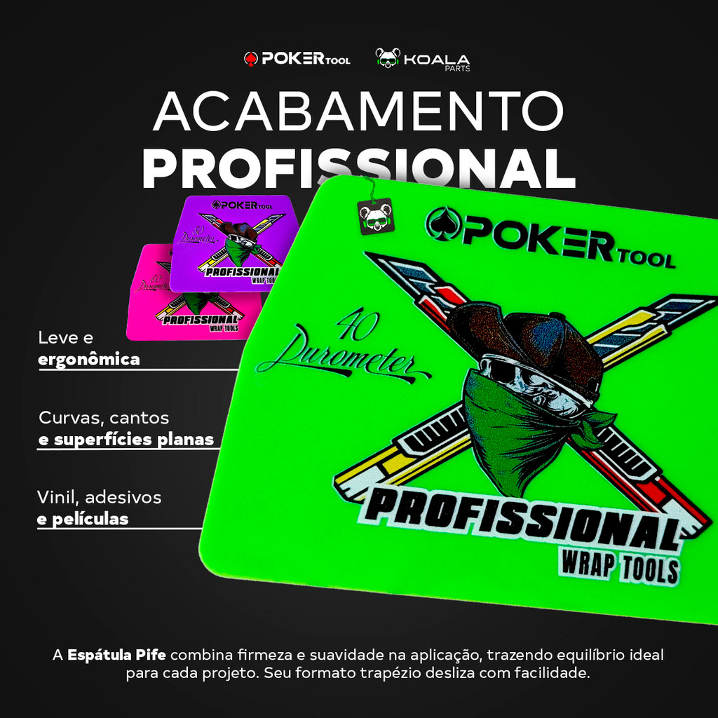 Espátula Profissional Pife - Poker Tool >> Durezas/Cores: 40 Verde, 60 Rosa e 80 Roxa ALTA PRECISÃO NA MEDIDA CERTA! A Espátula Pife combina firmeza e suavidade na aplicação, trazendo o equilíbrio ideal para cada projeto. Seu formato trapézio, com cantos curvos e bordas finas, desliza com facilidade em cantos, curvas e superfícies planas. Feita em material siliconado de alta qualidade, conta com frisos antiderrapantes e design ergonômico que garantem pegada firme e confortável, mesmo em usos prolongados. - Toque emborrachado e seguro - Bordas finas e arredondadas - Material resistente a durável - Deslizamento suave em qualquer superfície Benefícios: 1. Protege o vinil contra riscos e marcas 2. Elimina bolhas e marcas com facilidade 3. Formato versátil para diferentes acabamentos 4. Ergonomia que evita fadiga >> Disponível em 3 níveis de dureza, para você escolher o que melhor se adapta à superfície ou ao material em que será aplicado. Guia rápido de durezas: Verde - 40 (Flexível): curvas, dobras e acabamentos delicados Rosa - 60 (Semirrígida): uso geral, o “coringa” do baralho Roxa - 80 (Rígida): planos, expulsão de ar e precisão máxima Enviamos bem embalado, super rápido e com garantia de originalidade. Garanta o seu e confira os outros produtos da nossa Loja Koala Parts. Especificações Técnicas Material: Plástico emborrachado Formato: Trapézio Tipo: Lisa Dureza: 40 (Flexível) / 60 (Semirígida) / 80 (Rígida) Cores disponíveis: Verde, Rosa e Roxo. Conteúdo da Embalagem: 1 Espátula Profissional Pife Poker Tool