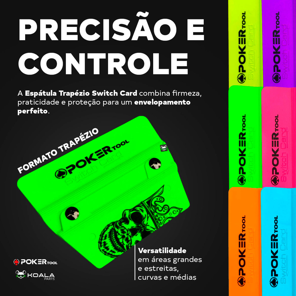 Espátula Trapézio com Feltro (Buffer adesivo) Switch Card — Poker Tool >> Cores: Azul, Laranja, Rosa, Roxo, Verde Limão, Verde Neon PRECISÃO E CONTROLE NA PALMA DA MÃO! A Espátula Trapézio Switch Card Poker Tool combina firmeza, praticidade e proteção para um envelopamento perfeito. Seu formato trapézio garante versatilidade: ideal para áreas estreitas, curvas e também superfícies médias. - Formato trapézio — versatilidade em áreas grandes e estreitas - Bases intercambiáveis (Switch Card) - Feltro adesivo protetor incluso - Frisos centrais para firmeza no uso - Cores fluorescentes exclusivas Poker Tool Feita em plástico rígido, é resistente e ergonômica, além de acompanhar feltro adesivo protetor (buffer) que evita riscos e marcas em vinil, PPF e adesivos. SWITCH CARD — BASES INTERCAMBIÁVEIS Troque as bases com facilidade e tenha múltiplas espátulas em uma só ferramenta. Benefícios: 1. Protege vinil e pintura contra riscos 2. Facilita aplicações em áreas difíceis 3. Acabamento limpo e profissional 4. Economia de tempo e maior eficiência 5. Compatível com outras bases da linha Switch Card Enviamos bem embalado, super rápido e com garantia de originalidade. Garanta o seu e confira os outros produtos da nossa Loja Koala Parts. Especificações Técnicas: Material: Plástico rígido Formato: Trapézio Tipo: Switch Card Intercambiável Cores disponíveis: Azul, Laranja, Rosa, Roxo, Verde Limão, Verde Neon. Conteúdo da Embalagem: 1 Espátula Trapézio Poker Tool 1 Feltro adesivo protetor (Buffer)