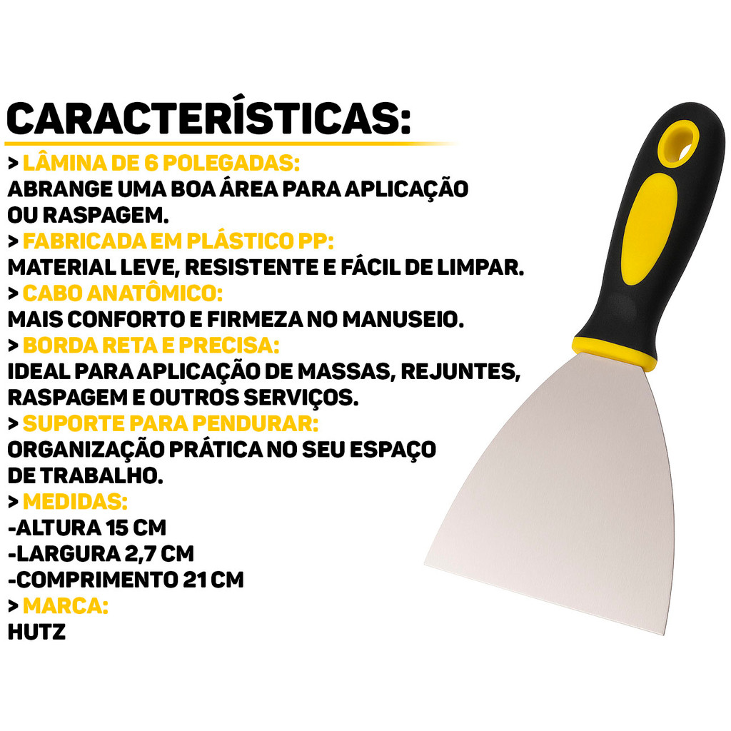 Espátula 6 Polegadas Hutz A Espátula Hutz é a ferramenta ideal para profissionais da construção civil, pintura e reformas em geral. Projetada para oferecer resistência e precisão, ela é perfeita para aplicações como nivelamento de massas, remoção de resíduos e acabamentos em superfícies diversas. Características: > Espátula com lâmina de aço inox e cabo em plástico; > Ideal para raspagem e aplicação de gesso, massa corrida e massas de textura; > Resistente à oxidação e fácil de limpar, garantindo longa vida útil mesmo com uso intenso. Especificações Técnicas: > Material: aço inox e plástico; > Dimensões do produto (C x L x A): 21,3cm x 15cm x 2,7cm. - Marca: Hutz - Garantia: 90 dias contra defeitos de fabricação Vantagens de comprar na Brester: - Produto a pronta entrega. - Produto novo, com garantia de fábrica. - Nota fiscal para Pessoa Física e Pessoa Jurídica.