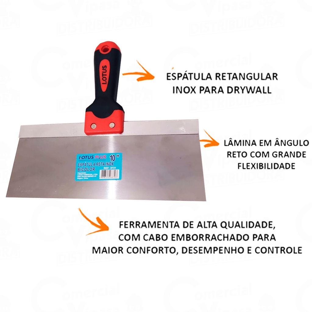 Espátula Reta Inox bicolor Gesso Drywall Cabo Emborrachado Lotus Profissional Vários Tamanhos