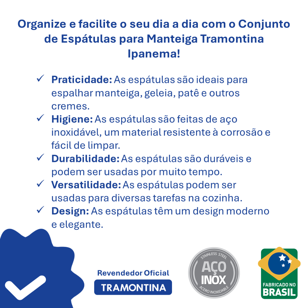 | Espátulas Manteiga Tramontina Ipanema 6 Peças este produto | R$ 30,59 | — | 5.0/5 | 10 |