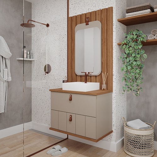 DISTRIBUÍDO POR C.JAU FERRAMENTAS ESPELHEIRA MONET CAPPUCCINO DESCRIÇÃO: A Espelheira para Banheiro da Linha Monet na cor Cappuccino, tem tamanho de 48x80,5cm e profundidade 1,5cm. Possui alça diferenciada em couro sintético e design super atrativo, em seu kit já vem com gancho metálico na cor cobre fosco com parafusos e buchas para fixação na parede ou painel ripado. A MGM Móveis surgiu em abril de 2004, iniciado suas atividades em um pequeno galpão e com uma produção 100% artesanal. Hoje a MGM Móveis conta com uma moderna fábrica e produz cerca de 30 mil peças por mês, em material de qualidade e sempre buscando inovação e designs exclusivos. Seus produtos são fabricados 100% em MDF reflorestado, respeitando o meio ambiente e o desenvolvimento sustentável. ESPECIFICAÇÕES: Cor: Cappuccino Material: 100% MDF Modelo: Monet Marca: MGM Móveis Madeira do Produto: 100% MDF Acabamento: Pintura UV Altura (cm): 80,5 Profundidade (cm): 1,5 Largura (cm): 48 Não requer montagem Código EAN: 7898942626951 DICAS PARA LONGEVIDADE: Proteja o móvel da umidade e luz solar direta. Evite sobrecarregar as estruturas e mantenha as instalações hidráulicas em bom estado. Limpeza prática e segura, assegurando a conservação do móvel. NOTA: Torneira, espelho, pia e acessórios como válvula, sifão e engate não estão inclusos. FOTOS ILUSTRATIVAS PARA MOSTRA COMO FICA O GABINETE