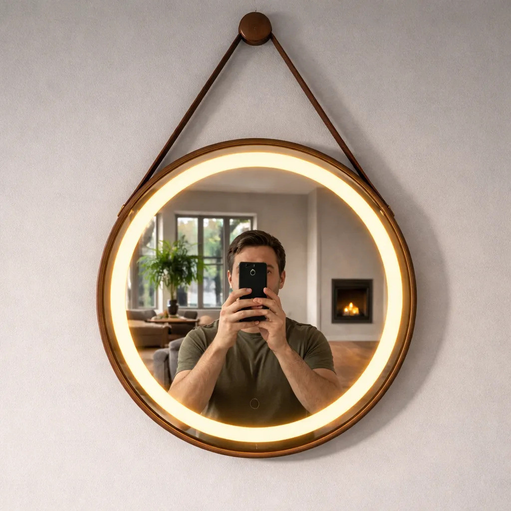 --> Iluminação LED Integrada com 3 Cores: Branco frio, branco quente e branco neutro em um único espelho. --> Controle de Intensidade Touch: Ajuste a intensidade da iluminação com um simples toque e segure para escolher o nível ideal de luz. --> Acabamento Jateado: Bordas foscas que proporcionam um visual clean, moderno e premium, além de suavizar o brilho ao redor do espelho. --> Borda em Couro: Detalhe sofisticado que agrega charme e personalidade, inspirado no clássico design Adnet. --> Instalação Versátil: Compatível com parede de alvenaria, drywall ou móveis (suporte traseiro incluso). Benefícios - Estilo: Traz sofisticação e destaque para qualquer espaço — ideal para quartos, salas, lavabos e áreas de vestir. - Praticidade: Fácil de limpar e manter sempre impecável. - Conforto: Iluminação perfeita para maquiagem, skincare, barbear ou para criar um clima aconchegante no ambiente. Especificações Técnicas - Espessura: 3mm - Material: Espelho jateado - Acabamento: Borda em couro - Voltagem: Bivolt 110/220 V - Consumo: 12W (econômico) - Acionamento: Botão Touch-Screen - Cores de Luz: Branco Frio, Branco Quente e Branco Neutro - Função Extra: Controle de intensidade da iluminação Conteúdo da Embalagem 1 Espelho Adnet Jateado com LED 3 Cores e Borda em Couro Pino de Suporte para fixação