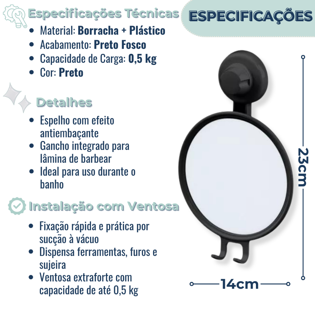 SOBRE O PRODUTO O Espelho possui efeito antiembaçante e gancho para lâmina de barbear. Ao iniciar o banho, desencaixe o espelho da ventosa e segure-o debaixo da água quente por alguns segundos. Sem a diferença de temperatura entre a água quente e o espelho, o mesmo não embaçará. Ao final do banho, jogue água limpa sobre o espelho e deixe secar naturalmente. O sistema de instalação com ventosa dispensa o uso de ferramentas, os furos e a sujeira. Utiliza a sucção a vácuo para fixar o produto de forma rápida e prática. A ventosas da Future são extrafortes e, neste produto, possue capacidade de suportar até 0,5kg. Itens inclusos: 1 Espelho com Gancho + 1 Ventosa INSTALAÇÃO - Correto: superfícies lisas, brilhantes e totalmente planas como vidros, espelhos, azulejos, cerâmicas não porosa, pinturas lisas e brilhantes (epóxil) e laminados. - Incorreto: superfícies curvas, foscas ou porosas como papel de parede, madeira, parede de cimento, mármore, granito, etc. RECOMENDAÇÕES - Remover regularmente (a cada 3 meses) e reaplicar conforme instruções de montagem. - Nunca utilize este produto com pesos superiores ao indicado na embalagem. - Não utilize este produto para acomodar produtos frágeis e de valor. - Não use chaves, facas e objetos pontiagudos para retirar o produto da superfície. MEDIDAS - Profundidade: 4,5cm - Lagura: 14,5cm - Altura: 23cm - Peso: 0,112kg ESPECIFICAÇÕES - Máteria Prima: Borracha + Plástico - Cor/Acabamento: Preto Fosco - Capacidade: 0,5kg