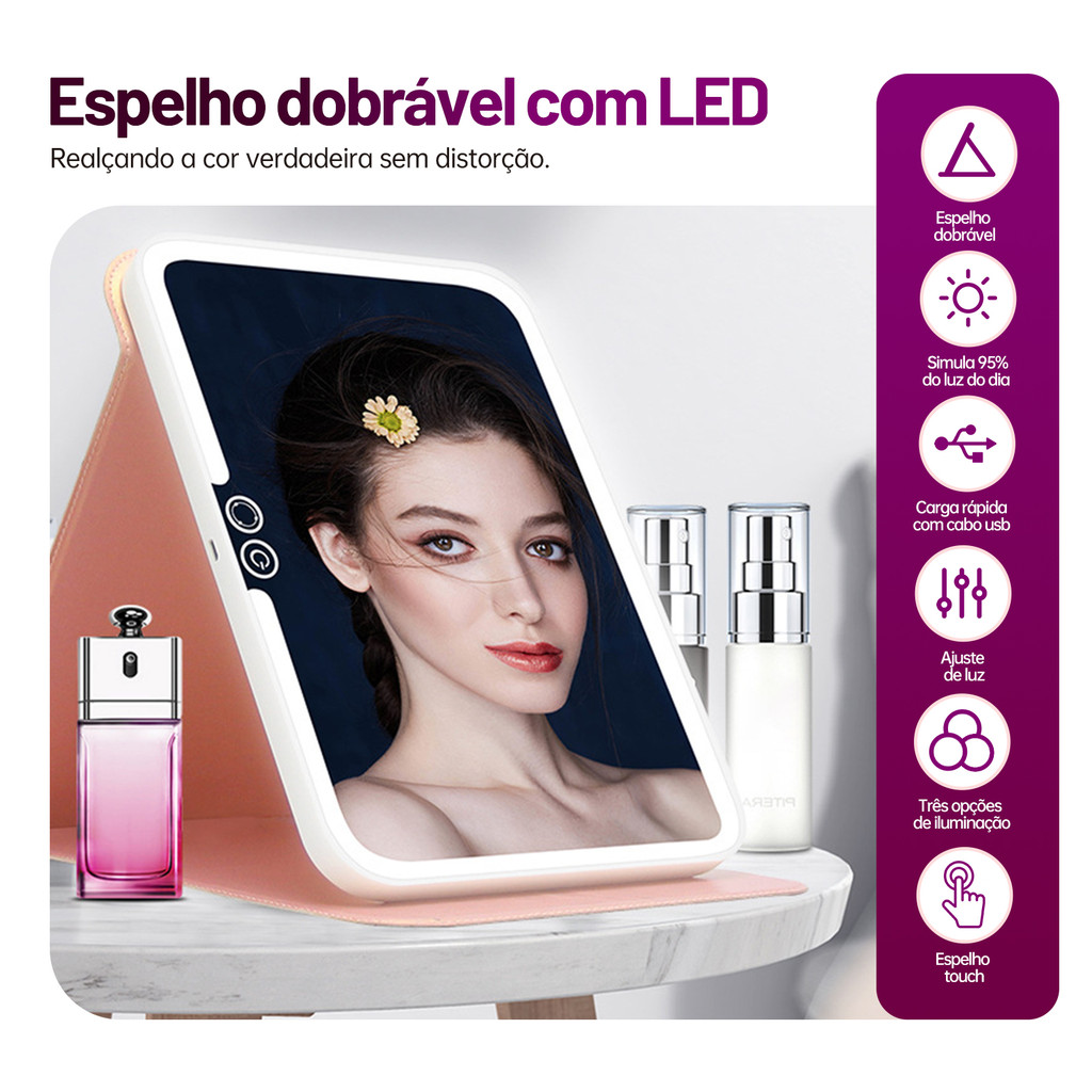 Espelho com Led para Maquiagem Capa de Couro Smart Mesa Dobrável Portátil Luz Ajustável Recarregável
