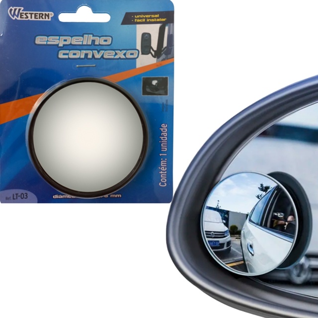 Este anúncio contém: 1 (um) Espelho convexo (Olho de Boi) original da marca Western. Código do Fabricante: LT-03; Código Universal: 7897186022031. DETALHES: Material de fabricação: Vidro e Plástico; Dimensões: 78mm; Produto de ótima qualidade e durabilidade; Validade indeterminada; Material leve e prático. Auxilia o condutor aumentando a área de alcance de visão, reduz acidentes, diminuindo os pontos cegos do veículo. Retrovisor auxiliar, diâmetro exato 78mm, fácil de instalar já vem com adesivo, basta colar no retrovisor. Modelo universal para carro, moto, trator, ônibus, caminhão, empilhadeira e diversos outros veículos. Pode ser utilizado tanto no retrovisor esquerdo (motorista) quanto no retrovisor direito (passageiro). Dúvidas frequentes: 1 - Trabalhamos apenas com produtos novos, e com garantia. 2 - Produto a pronta entrega. 3 - Seus produtos serão enviados em até 24 horas úteis após a confirmação do pagamento. Sobre a empresa: Somos uma Auto Peças fundada em 1980, atuamos no mercado varejista de peças e acessórios, tendo como principais clientes oficinas mecânicas e consumidor final. Não achou o que procura? Ficou com alguma dúvida sobre o produto? Fale conosco através do campo de perguntas.